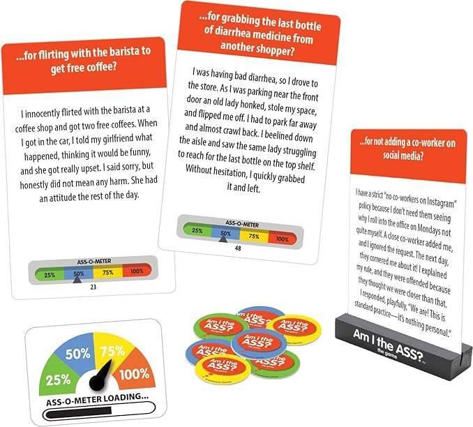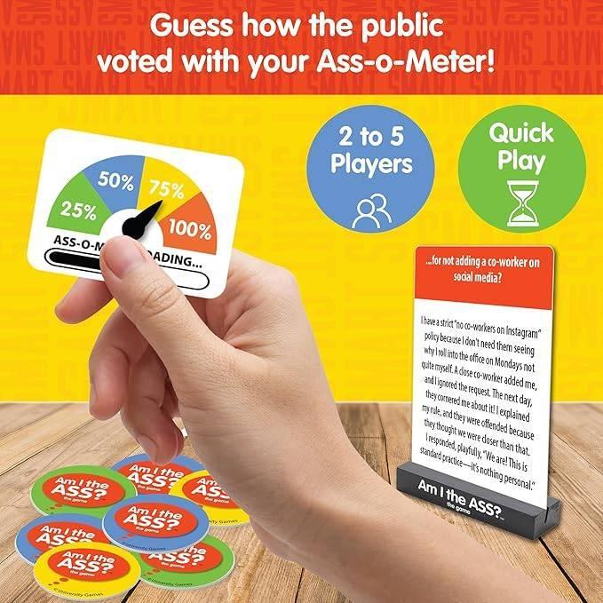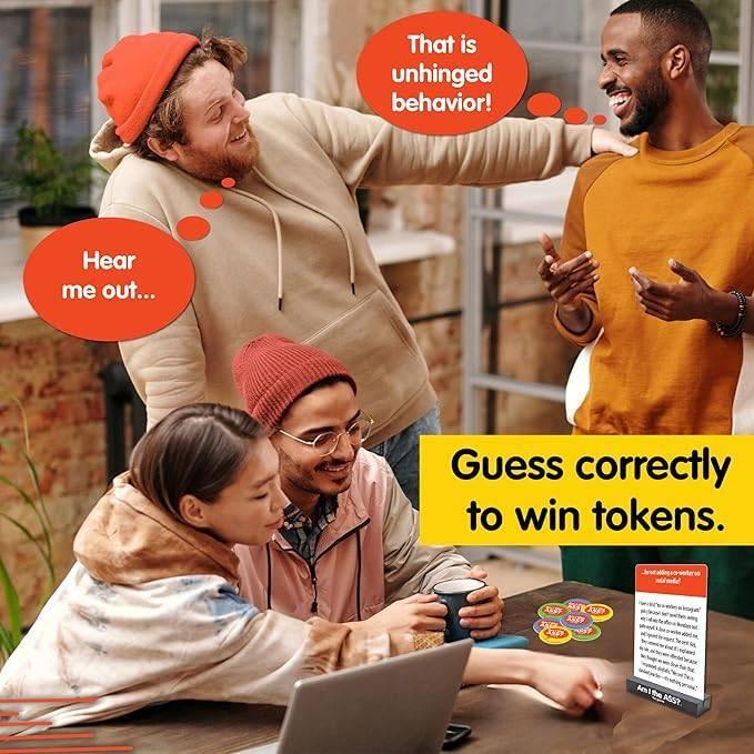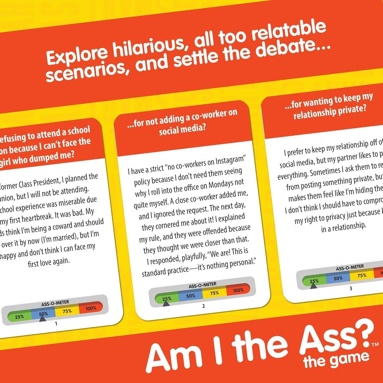 Experience Am I The A*, the party game that puts your judgment to the test! With 150 real-life Scenario Cards, players decide if someone was genuinely in the wrong or just caught in a tough situation. Predict how 500 people worldwide responded, and use your A*-o-Meter to earn tokens.The first to collect five wins! Perfect for sparking laughter and lively debates at any gathering.*Features:** 2–5 Players* Ages 18+