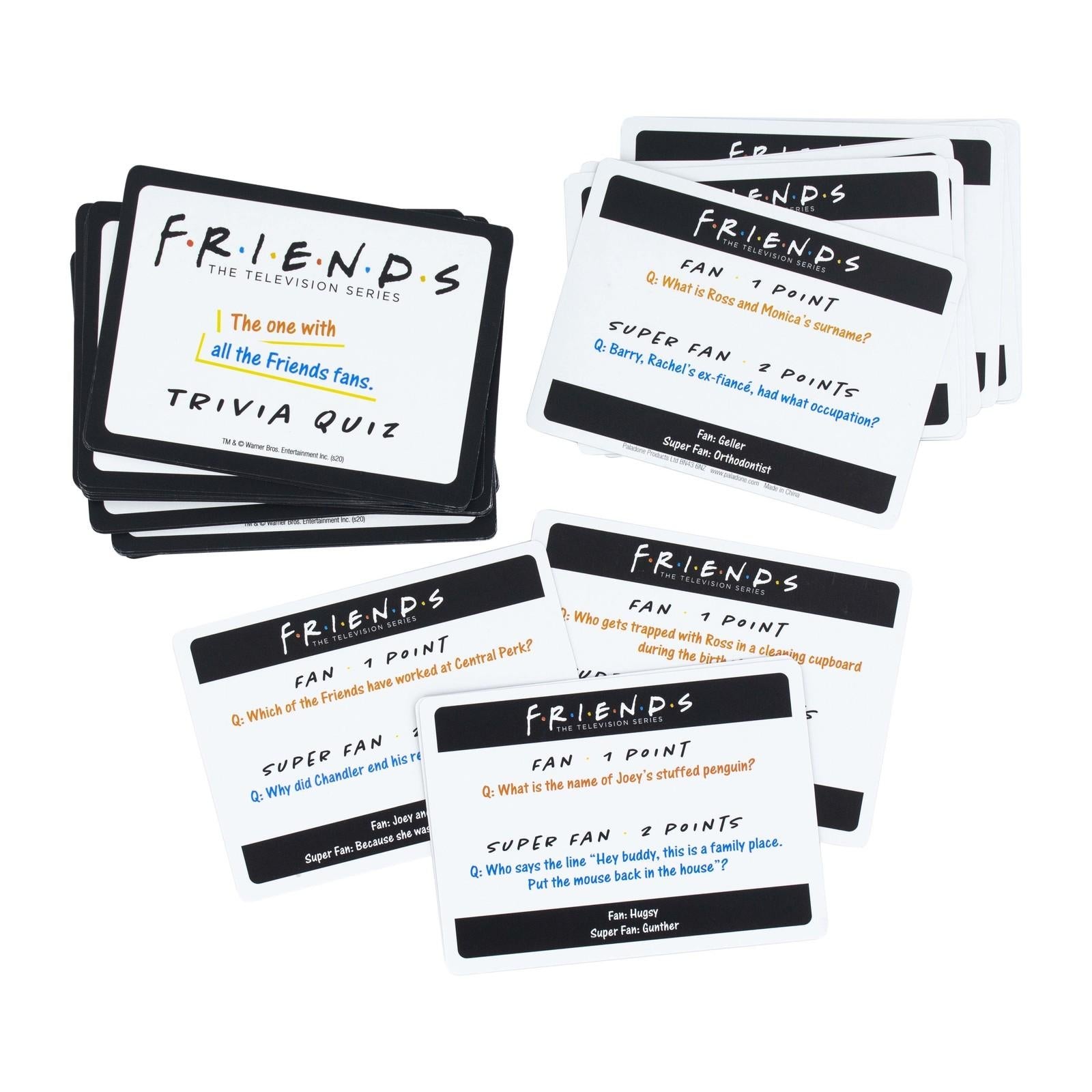 Can you remember what Joey's stuffed penguin is called? or which of the Friends has worked in Central Perk? This second edition Friends Trivia Quiz gives you another 100 questions to test your knowledge, along with friends and family as to how much you all learnt and remember about Friends, the Television Series. There are two levels of questions, so you can opt for the more difficult super-fan category in order to gain more points!Everything you need to play is included in the box along with full gameplay instructions. Small and lightweight this Friends Trivia Quiz Second Edition is perfect for taking with you on a long journey, on holiday or take on your next family gathering to keep everyone off their phones so you can all spend some quality, fun time together.* Includes 50× quiz cards and full gameplay instructions.