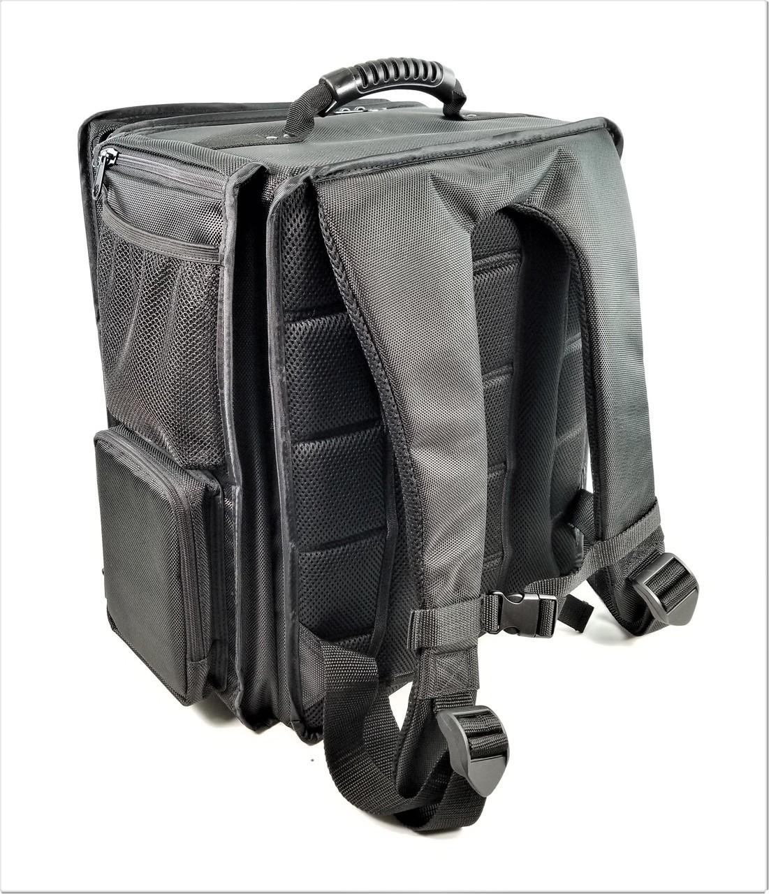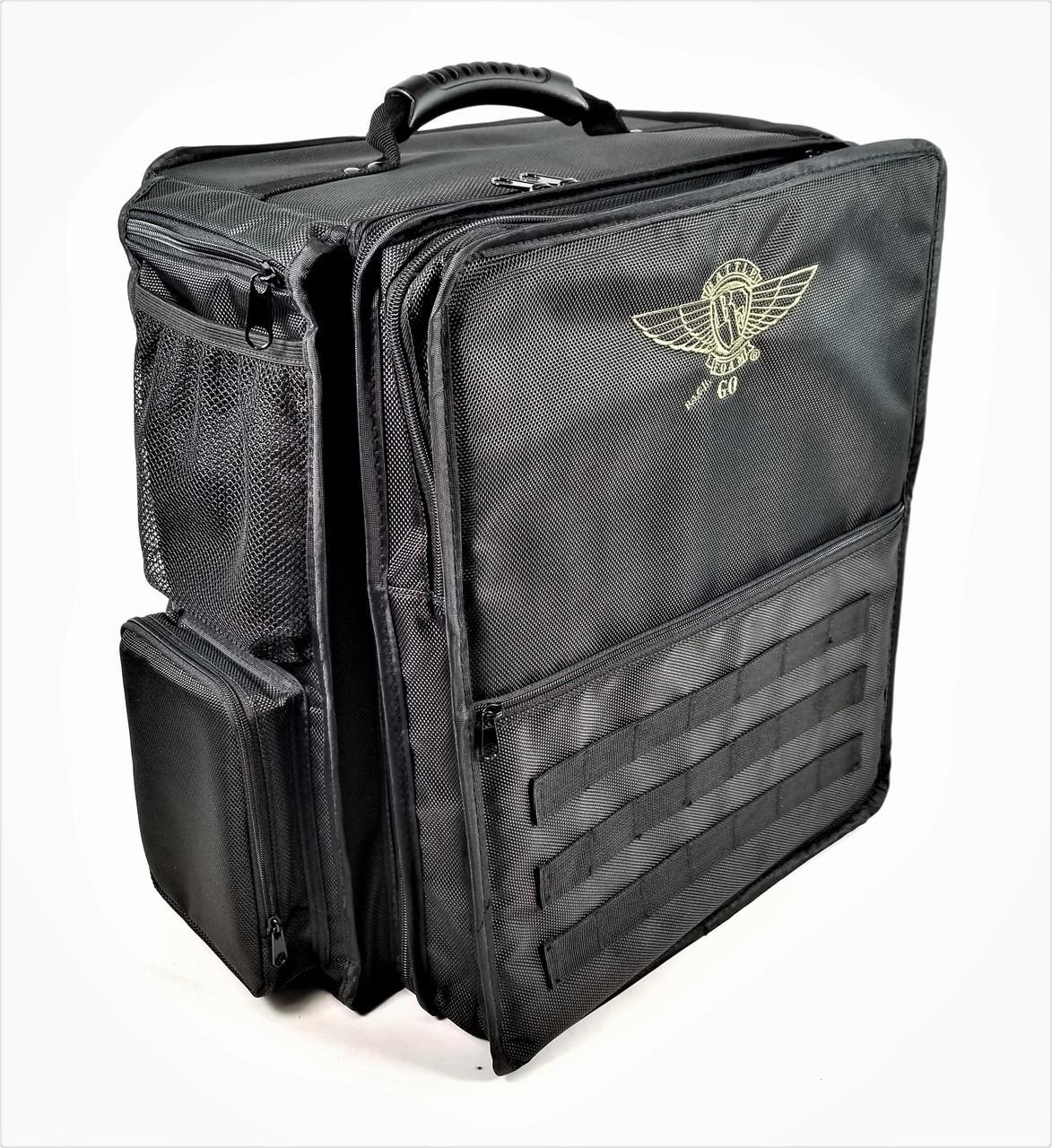 *Battlefoam: P.A.C.K. Go 2.0 – Standard Load Out (Black)*The P.A.C.K. (Personal Army Combat Kit) Go 2.0 will hold 9 inches (229 mm) of Battle Foam Large (BFL) size foam trays (15.5W x 12L) or 15.5 inches (394 mm) of Battle Foam Small (BFS) size foam trays (11.5W x 7.75L). Its rugged, ballistic nylon exterior protects a hard plastic interior built for strength and durability. Pockets are available to hold gaming and personal accessories, rule books, laptops and tablets. The front pocket of the P.A.C.K. Go can also securely hold 2.5” of Battle Foam Large size foam trays. This area is ideal if you require additional storage for miniatures or hobby tools. Please note that when taking out a tray in this section of the bag it P.A.C.K. should be set flat to keep the contents from spilling or breaking. This bag was designed for airport travel and meets all FAA regulations for carry-on luggage. Note: Please check your airlines carry-on guidelines before travel. The P.A.C.K. Go 2.0 features new side pockets and additional rivets on the handle for extra strength and support. It also offers a molle system, which allows you to further customize this bag to fit your specific storage and transportation needs. Molle accessories offer storage solutions for tablets and other small books, dice and other gaming accessories as well as cell phones and other personal items. To view and/or purchase these accessories, click here. This bag design has updated back pack straps and backing with extra padding for easy travel and comfort.This load out option comes fully loaded with pre-designed Battle Foam Large size foam trays. You will receive the following foam trays with your purchase:* 1× Battle Foam Large 32mm Space Marine Troop Foam Tray – 1.5 inch thick tray with 32× 2 × 1 1/4 inch (50 × 32 mm) cut outs, 4× 1 3/4 × 2 inch (44 × 50 mm) cut outs, 5× 2 × 2 inch (50 × 50 mm) cut outs and 1× 3 × 2 inch (76 × 50 mm) cut out.* 1× Battle Foam Large Warhammer 40,000 Large Model Foam Tray – 2 inch thick tray with 14× 2 3/4 × 1 3/4 inch (69 × 44 mm) cut outs, 10× 1 3/4 × 1 3/4 inch (44 × 44 mm) cut outs and 2× 3 1/4 × 2 inch (82 × 51 mm) cut outs.* 1× Battle Foam Large 4 inch (100 mm) thick Pluck Foam Tray. The pluck foam pieces are 1 inch (25 mm) squares. At times, pluck foam trays may require an exacto blade to cut through portions of the foam.* 1× Battle Foam Large Foam Topper*Specifics:** Tray Size – Battle Foam Large (15.5W x 12L" (394W x 305L mm))* Outside Bag Dimensions – 18W x 11L x 16H" (457W x 279L x 406H mm)* Large Front Pocket Dimensions – 16W x 3L x 13H" (406W x 75L x 330H mm)* Small Front Pocket Dimensions – 12W x 1L x 9H" (305W x 25L x 229H mm)