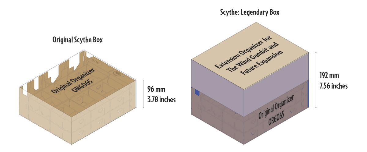 The Scythe: Legendary Box is designed to hold the *Scythe*core game plus all 3 expansions (the expansion components, not the boxes), the various accessories, promos, and a custom insert. We were inspired to create this box thanks to the feedback from people on this blog post.The box features a dual-layered bottom half and a top that is the exact same dimensions as all other *Scythe* tops, allowing backers and fans of the original top to use it interchangeably with the new top.While the Legendary Box does not include any game components, it contains 3 large tuckboxes to fill unused space (and, optionally, store tokens, cards, and other loose pieces). The latest printing also includes structural supports.Because the *Legendary Box* has the same length and width of all other *Scythe* boxes, any custom insert fits perfectly inside of it. However, it’s double the height of the original *Scythe* box, adding much more room.*The Legendary Box features the following:** 1 giant box (300×365×196mm)* 3 tuckboxes (70×289×118mm)* 2 spacers to protect the integrity of the box and the tuckboxes during shipping