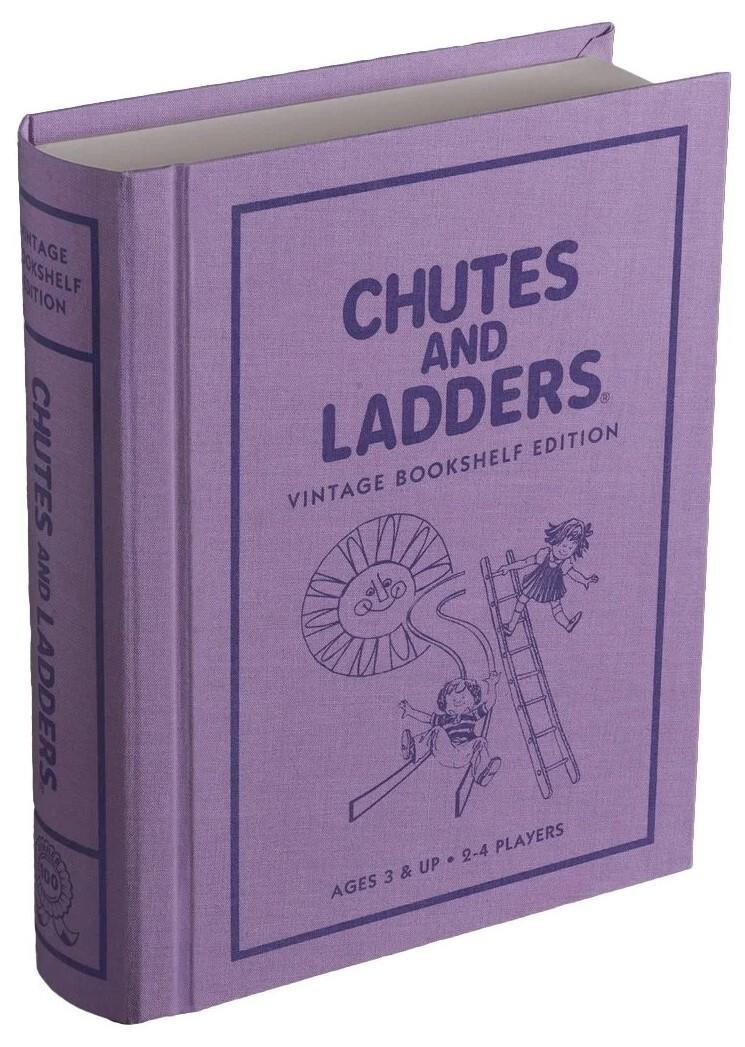 This vintage bookshelf edition of the classic CHUTES AND LADDERS® game is a terrific way for young children to learn about life's ups and downs. They will get to climb the ladder of success to reward their good deeds, while having to slide down the chute as a consequence for naughty ones. The object of the game is to reach 100, but surely everyone who experiences the fun and lessons of this terrific Linen Book Edition will be a winner! This collectible edition features the charming graphics from the 1979 game and is a fun way to teach counting and good sportsmanship. It is a timeless classic to be enjoyed by today's children and everyone who is still a child at heart.*Features:** Player: 2–4* Ages: 3+