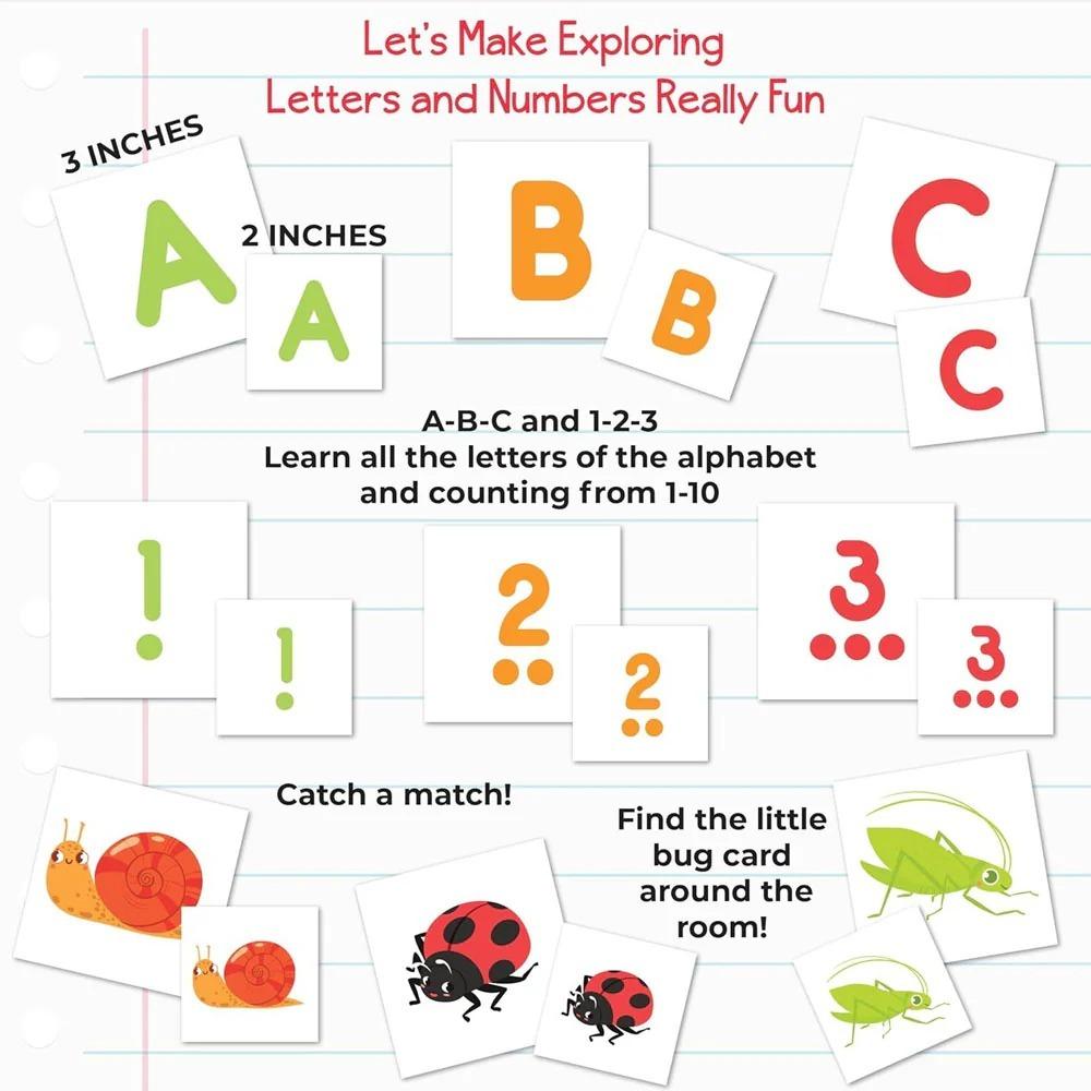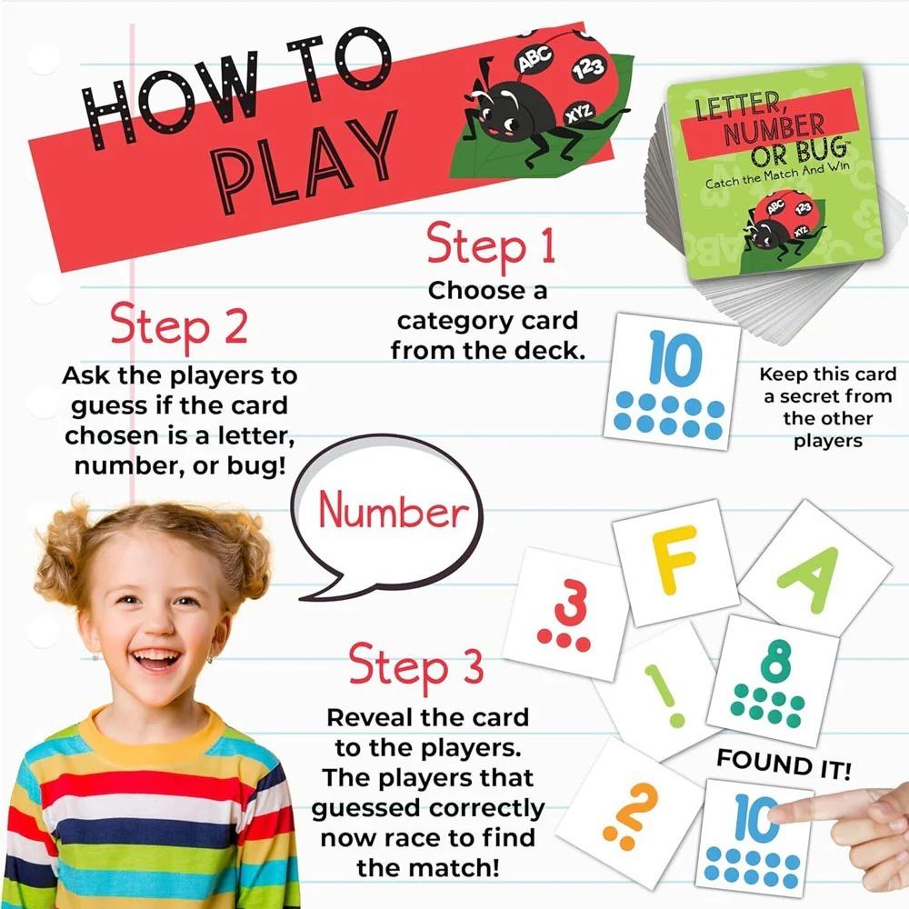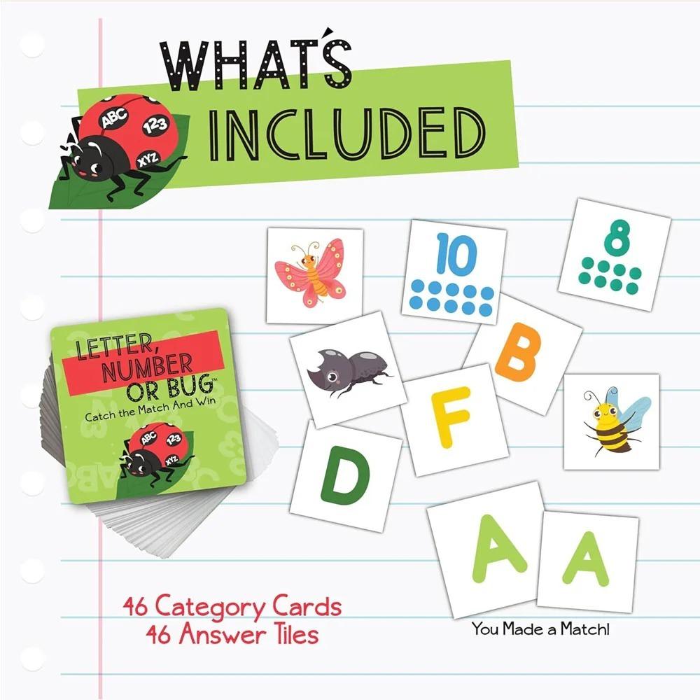 Catch the Match and Win. Let's Make Exploring Letters and Numbers Really Fun! Is the next card a letter, number or bug? Guess correctly, then race to find the matching letter or number on the face-up tiles available. Watch out! When a bug shows up, all players race across the room to grab the bug tile first. The first player to collect 5 matching tiles wins the game!*Features:** Diverse Game Cards: The game includes a variety of cards featuring letters, numbers, and bug images to engage players in different types of recognition and matching tasks.* Educational Focus: It helps children learn and reinforce their knowledge of the alphabet, basic numeracy, and different insects in a playful context.* Physical Activity: Players actively search for matching tiles, encouraging physical movement as part of the gameplay. Memory* Enhancement: The game tests and improves memory as players must recall the locations of previously seen tiles.* Interactive Gameplay: The game requires players to interact with the environment, making it a dynamic and engaging experience.* Competition and Cooperation: Players compete to find matches, but the game also encourages cooperative play and taking turns.* Family and Group Play: Designed for 2 to 4 players, it's an excellent game for family game nights or group play in a classroom setting.* Visual and Spatial Skills: As players match cards with tiles, they develop their visual discrimination and spatial awareness.* Variety in Gameplay: The mix of letters, numbers, and bugs ensures that each round of the game offers a new and varied experience, keeping it fresh and interesting for repeated play.* Play & Learn System: From Briarpatch, where learning and play intersect.* Players: 2–4* Ages: 3+*Contents:** 46 Category Cards* 46 Answer Tiles* Instructions.