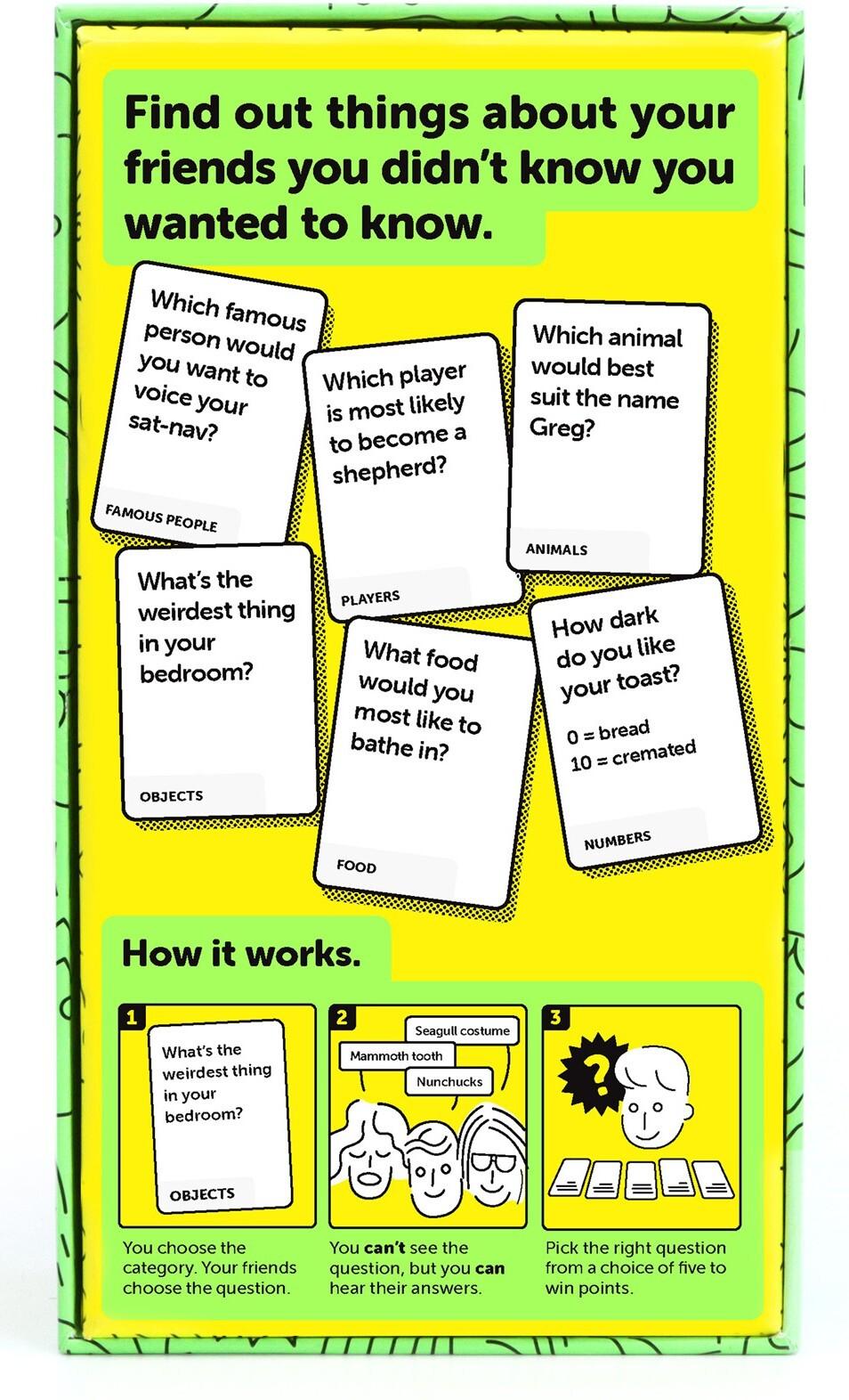 The hilarious card game to play with family or friends. Best with 3–8 players, this game is for kids, teenagers and adults. You can’t see the question, but you can hear the answers. Rank five dumb question cards from most likely to least likely to be the dumb question your friends just answered!Your friend has answered ‘7’. Is this how many times they washed their hair this week? How many squares of toilet paper they use when they poop? Or their ideal number of kids? Find out things about your friends you didn’t know you wanted to know, like what’s in their bedside table, or what animal they think would best fit the name Ian. OR, play as a fun icebreaker card game to make new friends! This family-friendly board game is easy to learn, quick to play, and with 400 cards, endlessly replayable.*Contents:** 400 Cards* 6 Dividers* 1 Board* Rules* Sticker*Features:** 3–8 Players* 10–20mins* Ages 10+