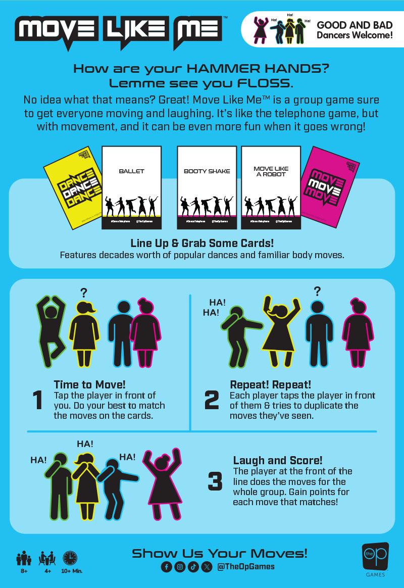 How are your Hammer Hands? Lemme see you Floss. No idea what that means? Great! Move Like Me is a group game sure to get everyone moving and laughing. It’s like the telephone game, but with movement, and it can be even more fun when it goes wrong!Game Components:150 cardsRules*Features:** 4–99 Players* 10mins* Ages 8+
