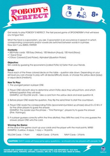 Decipher the jumbled words and phrases, called PoNos, to rack up the most points!2\. Place each of the three colored card decks on the table with the question side down. Depending on your skill level, you can choose to play with all decks/difficulty levels or choose the level right for you!3\. The youngest player is Player #1. Roll both dice to determine which PoNo deck to pull from and which question to read. The Color die will determine which deck color to pull a card from, and the Letter die will determine which question to read.4\. Flip the timer to start the countdown and draw the top card from the deck that matches the dice color. Player ONE reads the PoNo or jumbled phrase aloud for the other players to guess.5\. For example, if the phrase is ‘A NOSY LITTLE COOK,’ the first player to say ‘A COZY LITTLE NOOK’ collects the card for points.6\. If a player guesses correctly before the timer runs out, they WIN the card. If no one guesses the answer, Player ONE keeps the card.7\. When the game is over, count up your points:– Yellow cards are worth 1 point each. – Aqua cards are worth 2 points each. – Navy cards are worth 3 points each.8\. The player with the most points WINS!*Contents:** 300 Sturdy Spoonerism Cards (3 Decks = Easy, Intermediate and Difficult)* 1 Sand Timer* 2 Dice – One Color Die and One Letter Die* Instruction Sheet*Features:** 2+ Players* 15mins* Ages 8+