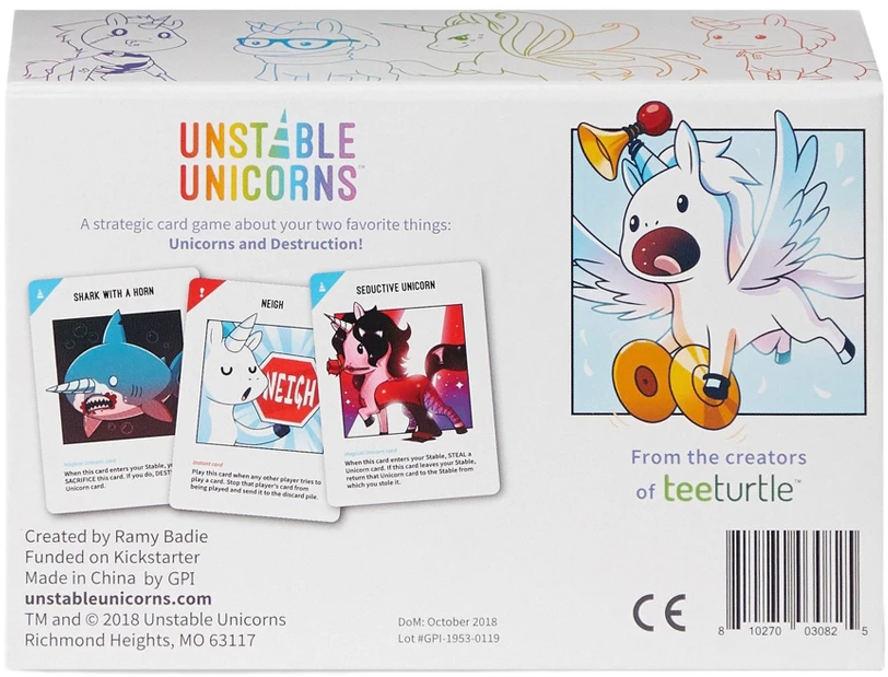 *Build a Unicorn Army. Betray your friends. Unicorns are your friends now.*There are over 20 Magical Unicorns to collect, and each has a special power. Build your Unicorn Army as fast as you can, or be destroyed by one of your so-called friends! Seek revenge or protect your stable using your Magic! Sound easy? Not so fast. Someone could have a Neigh Card (Get it? Neigh?) and send the game into MADNESS! The first person to complete their Unicorn Army shall hereafter be known as The Righteous Ruler of All Things Magical… at least until the next game. Good luck.*Features:** Unstable Unicorns is a strategic card game about everyone’s two favorite things: Destruction and Unicorns!* Learn how unstable your friendships really are.* You start with a Baby Unicorn in your Stable. SO CUTE!* But don't get too attached, because even Baby Unicorns aren't safe in this game!