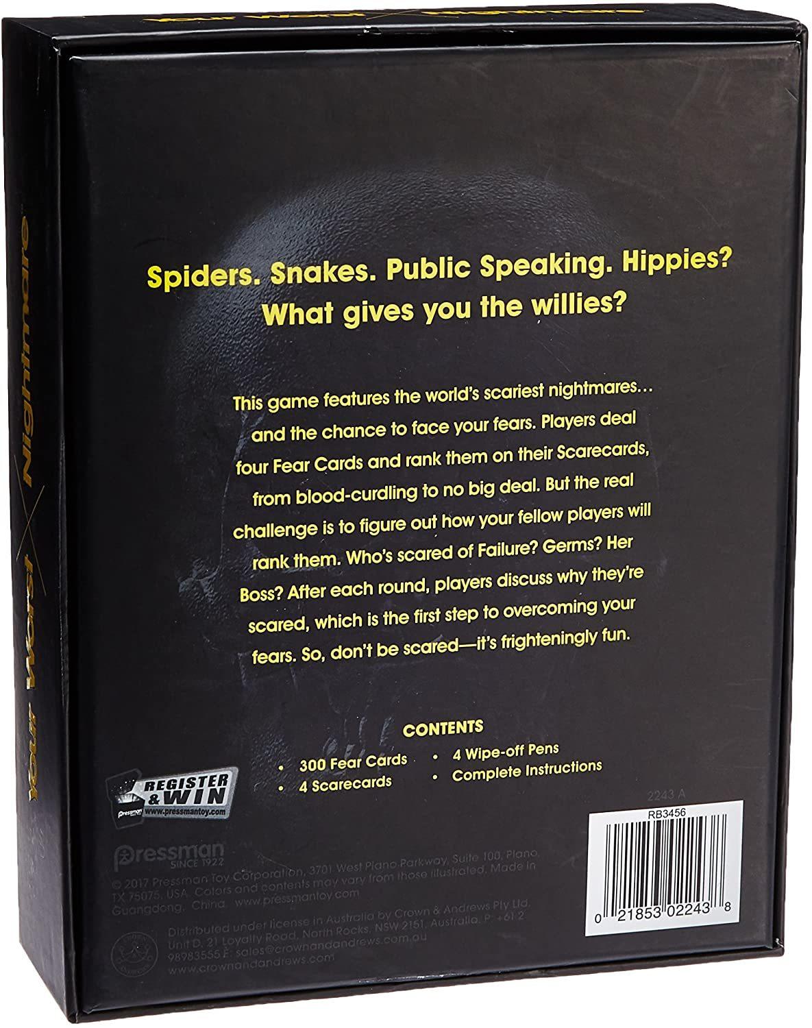 *Spiders. Snakes. Public Speaking. Hippies? What gives you the willies?*This game features the world's scariest nightmares…and the chance to face your fears. Players deal four Fear Cards and rank them on their Scarecards, from blood-curdling to no big deal. But the real challenge is to figure out how your fellow players will rank them. Who's scared of Failure? Germs? His or her Boss? After each round, players discuss why they're scared, which is the first step in overcoming your fears. So, don't be scared – it's frighteningly fun.*Features:** This frighteningly fun game features the world's scariest nightmares* Players face their fears as they rank others' Fears* A great ice-breaker, this game inspires conversation as players share what really scares them and why* Includes 300 beautifully photographed fear cards, ranging from horrifying to hilarious