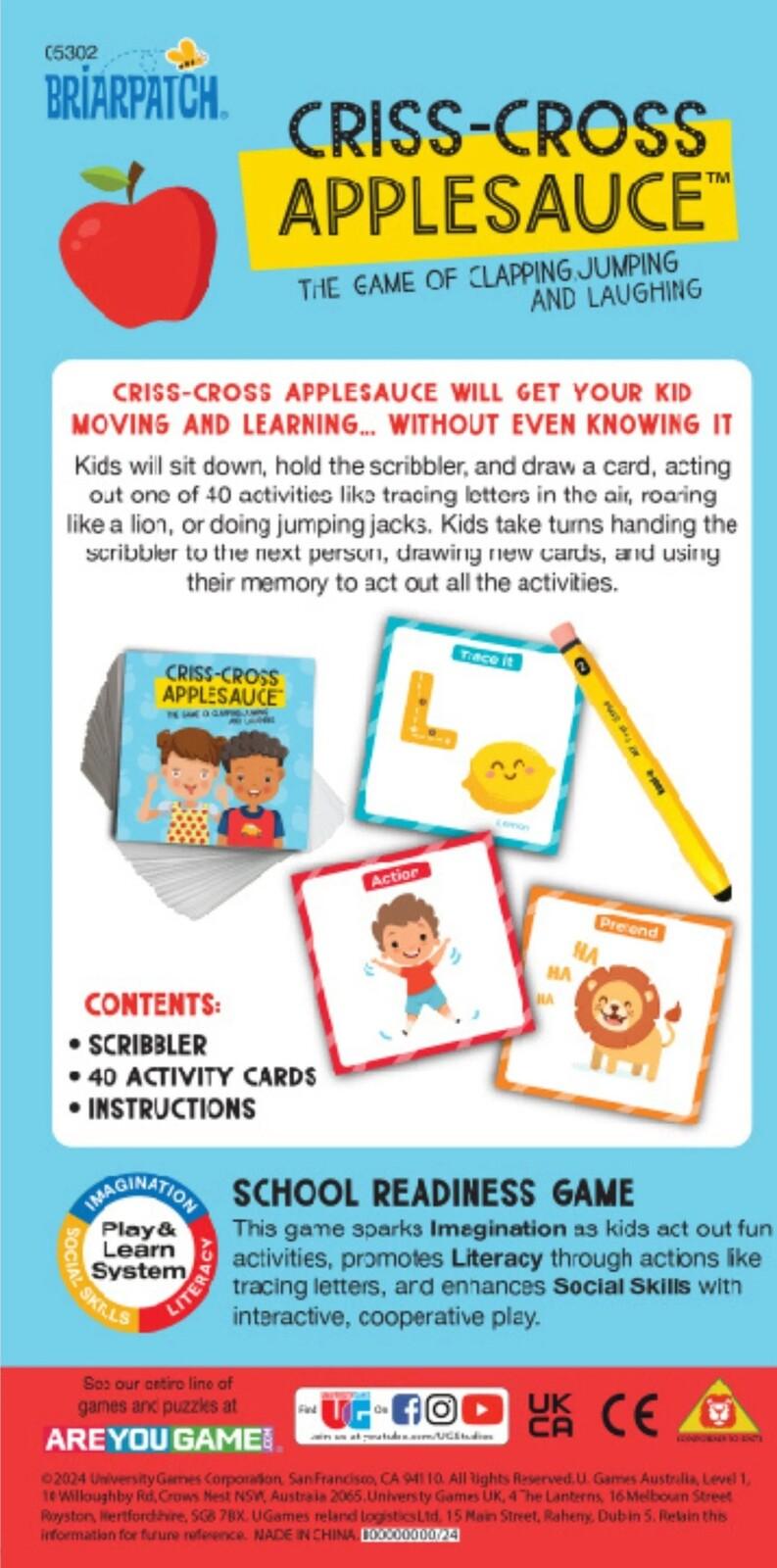 The Game of Clapping, Jumping and Playing Let's Get Kids Learning Without Even Knowing It! Sig down, hold the Talking Stick and draw a card. Next, act out one of the 48 activities like tracing letters, roaring like a lion, or doing jumping jacks. Take turns handing the Talking Stick to the next player, drawing new cards and using your memory to act out all of the activities.*Features:** Interactive Activity Cards: The game includes a set of cards that prompt players to act out various fun and imaginative activities.* Creative Expression: Players are encouraged to interpret and perform the activities on the cards in their own unique way, fostering creativity and self-expression.* Physical Movement: The game involves physical activities like mimicking animals or performing simple tasks, promoting gross motor skills.* Memory Component: As the game progresses, players need to remember and perform a sequence of actions, enhancing memory skills.* Circle Play Setup: Players sit in a circle, making it a socially inclusive game that encourages interaction and communication among participants.* Educational Value: The activities in the game can be both fun and educational, teaching children about different actions, animals, and simple tasks.* Family Friendly: Suitable for players of all ages, making it an excellent choice for family game nights or gatherings with friends.* Simple Rules: The game has easy-to-understand rules, making it accessible for young children and easy to start playing quickly. Portable and Easy to Set Up: The game components are easy to transport and set up, ideal for playing in various settings, from classrooms to living rooms.* Play & Learn System: From Briarpatch, where learning and play intersect. 18 Sturdy Activity Cards, 1 Talking Stick, Instructions.* Ages 3+*Contents:** 48 Sturdy activity cards* Talkin stick* Instructions