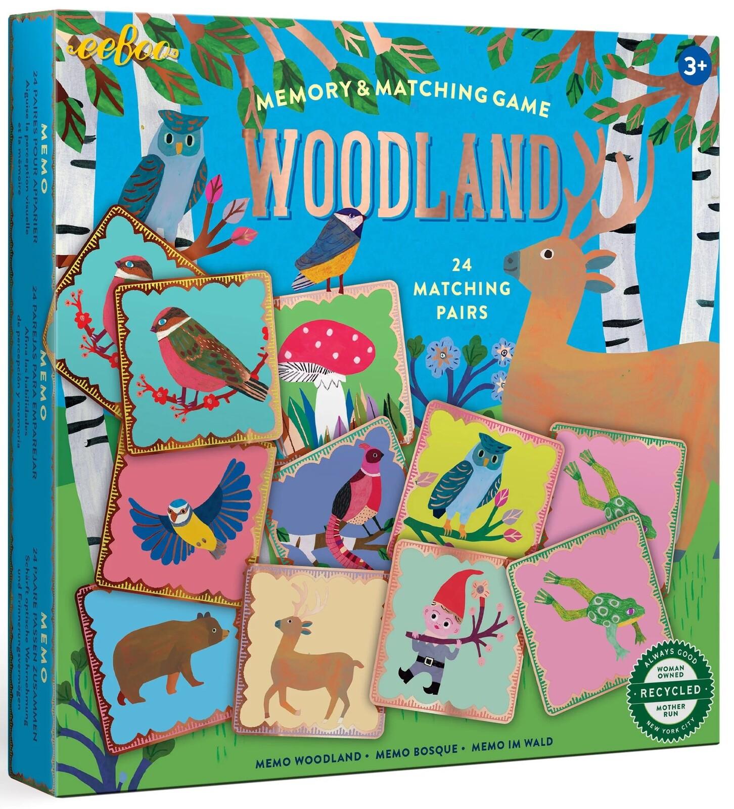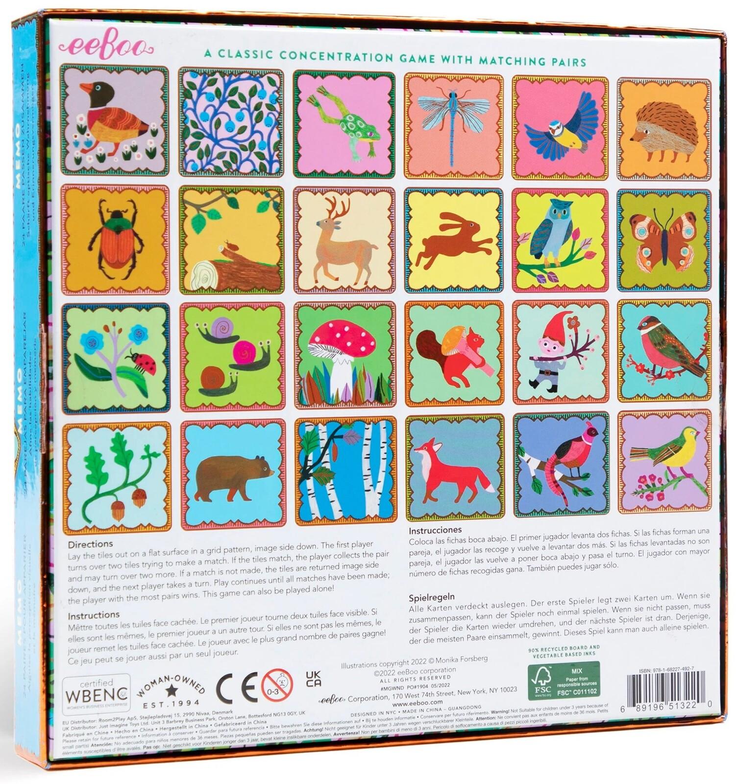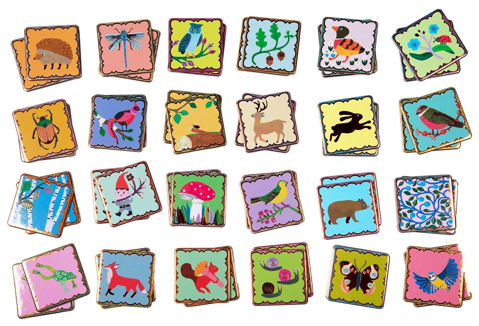 Invite your child into a world of natural wonder with this Woodland Memory & Matching game. Turn over each card to explore amongst the trees, meeting animal friends and discovering new wildlife. Each set contains 24 beautifully illustrated matching pairs finished with a luxurious copper colored gilding.These tiles, illustrated by Monika Forsberg and printed on thick glossy cardboard, feel lovely to hold and make a simple yet artistic tabletop delight. Perfect to be played with friends or as a challenge alone.*Contents:** Foil Box* 48 Tiles*Features:** Skills: Recognition, concentration, memory skills, storytelling & imagination.* Age: 3+* Tile size: 2.25" x 2.25"* Box size: 9.5" x 9.5" x 1.5"
