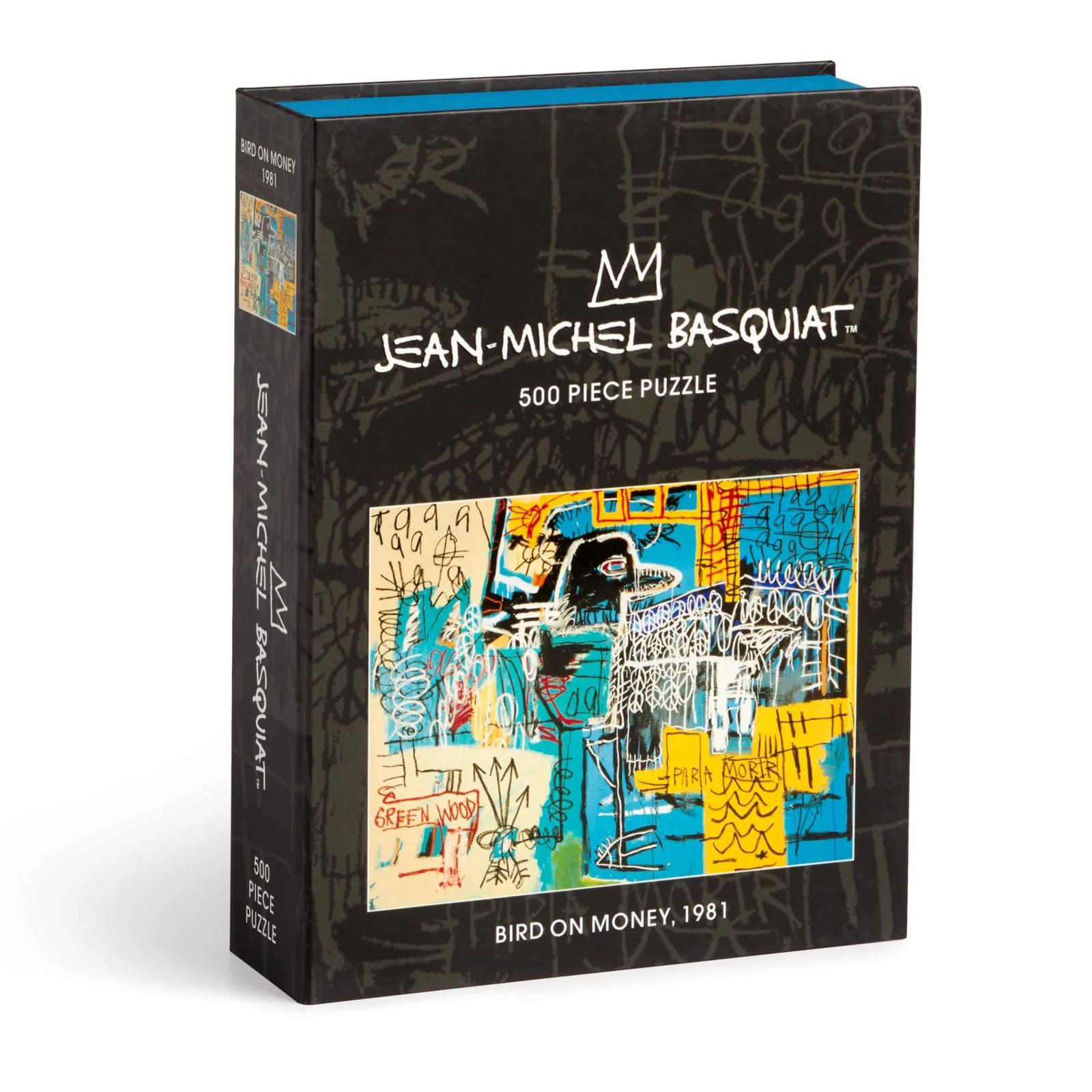 The Basquiat Bird on Money 500 Piece Book Puzzle features the artist’s iconic Bird on Money painting, a tribute to Charlie Parker, which tells the story of Basquiat’s work in greater detail. Basquiat was a musician, a jazz fan, and often painted with jazz playing in the studio. This book-shaped keepsake box has a magnetic closure and looks great on the bookshelf or coffee table.*Features:** Box: 165 × 210 × 50 mm.* Puzzle Size: 356 × 470 mm.* Keepsake box with magnetic closure with printed interior box liner.* Includes colour puzzle insert with full puzzle image.* Puzzle greyboard contains 90% recycled paper.* Packaging contains 70% recycled paper and is made responsibly from FSC-certified material.* Printed with nontoxic soy-based inks.
