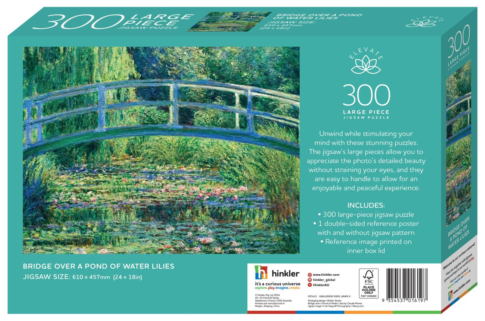 *Hinkler: Bridge Over a Pond of Water Lilies – Large Piece Puzzle (300pc Jigsaw)*Get lost in the tranquillity of Monet’s masterpiece with the Elevate 300pc Jigsaw: Bridge Over a Pond of Water Lilies The puzzle's large pieces allow you to appreciate the delicate brushstrokes and calming colours without straining your eyes, and they are easy to handle and interlock to allow for an enjoyable, peaceful experience.Use the reference image printed on the inside of the box lid, or if you need a little more help, there's a double-sided actual-size reference poster with and without the jigsaw pattern. Whether you're a seasoned puzzler or just starting out, this captivating puzzle promises entertainment and satisfaction!*Features:** Puzzle size: 610 × 457mm.* Jigsaw pieces are large and easy to see and handle to allow for an enjoyable experience.* Age: Adult
