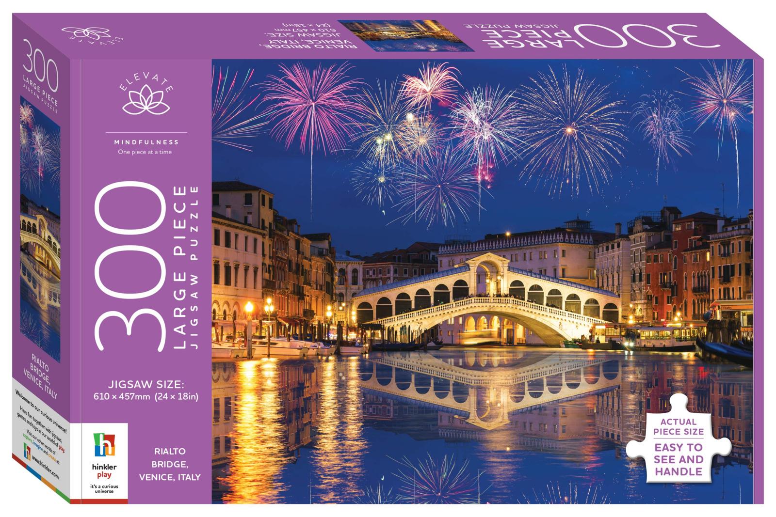 *Hinkller: Rialto Bridge, Venice, Italy – Large Piece Puzzle (300pc Jigsaw)*Float along the romantic canals of Venice with the Elevate 300pc Jigsaw: Rialto Bridge, Venice, Italy. The puzzle's large pieces allow you to appreciate the fireworks exploding above the intricate architecture and surrounding beauty without straining your eyes. The pieces are also easy to handle and interlock to allow for an enjoyable, peaceful experience.Use the reference image printed on the inside of the box lid, or if you need a little more help, there's a double-sided actual-size reference poster with and without the jigsaw pattern. Whether you're a seasoned puzzler or just starting out, this captivating puzzle promises entertainment and satisfaction!*Features:** Puzzle size: 610 × 457mm.* Jigsaw pieces are large and easy to see and handle to allow for an enjoyable experience.* Age : Adult