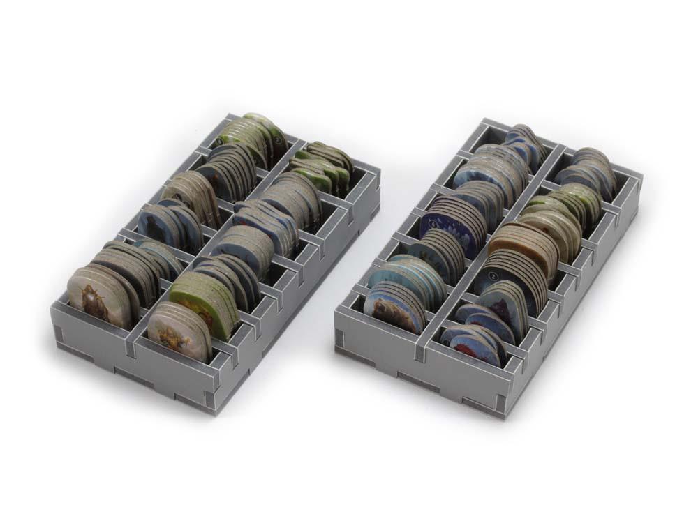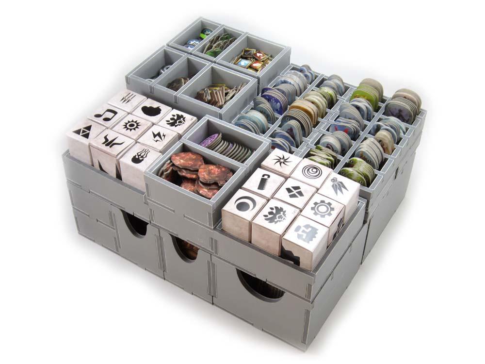 *Note: Gloomhaven Game Components & Box Sold Seperate**Insert designed for games with external box dimensions of 30 × 41.1 × 19.1 cm.*This insert is designed to be compatible with Gloomhaven®. The design provides both efficient storage and improved game play. Many of the trays can be utilised during the game, and they greatly aid set-up and clear-away times. There is space for all cards to be sleeved. The two monster stat sheet and card trays are designed so that the sheets act as dividers with the monster cards in between. This allows quick access to each monster in game and its relevant cards. These trays also contain the largest monster standees as shown in the image.Gloomhaven® is a big box game with many complex components. The order of placing the insert trays in the box is important to maintain a tight fit for protecting components and also to allow vertical storage. Please follow the sequence of placing trays below. Note that the smaller room tiles stand vertically on the right next to the character boxes.*Insert features:** Two monster standee vertical storage trays* Two medium monster standee trays* Four token trays* Two character mini box trays* Two monster stat sheet and card trays* Four small card vertical storage trays* Two large card vertical storage trays* One coin tray* One stand tray