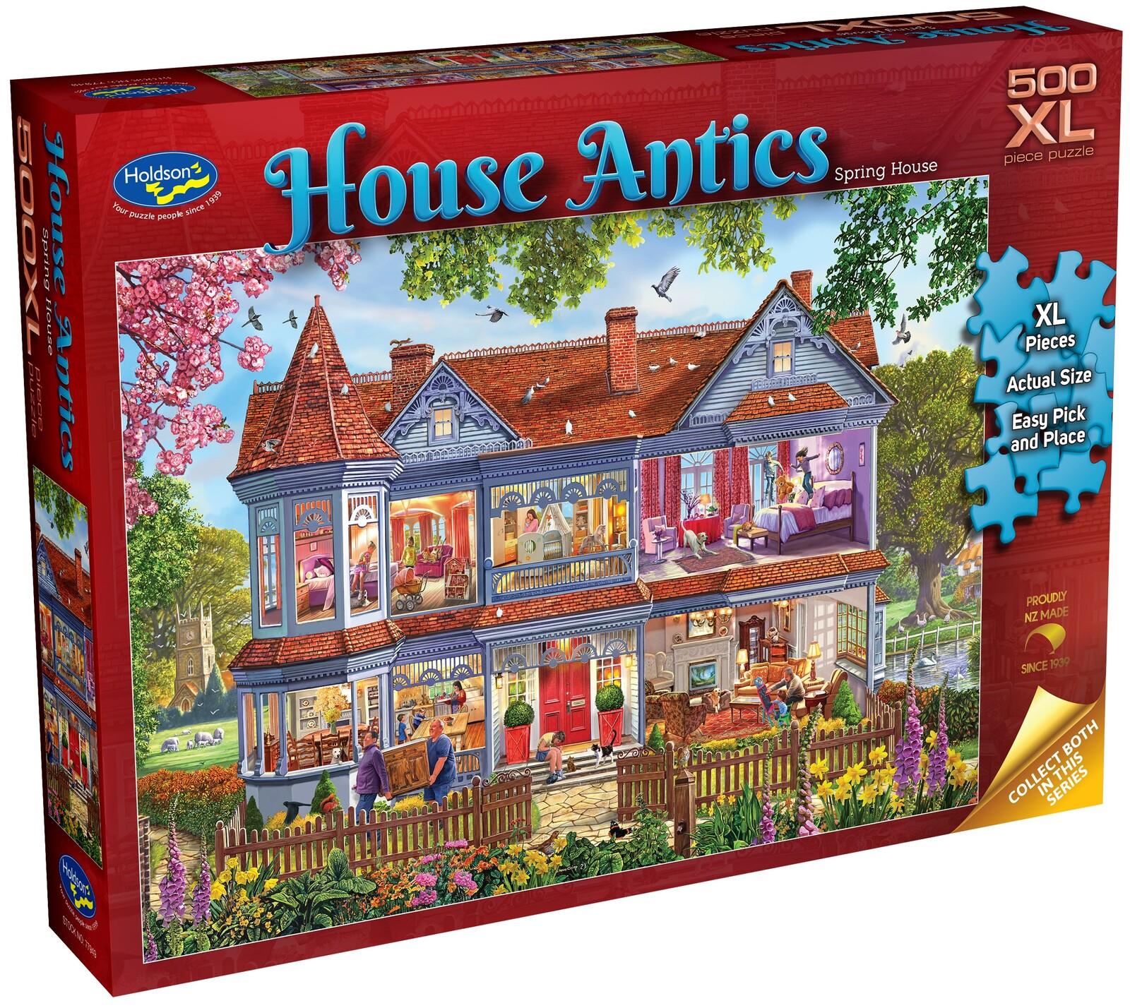 Discover the delightful details of home life with the House Antics 500XL jigsaw puzzle series, where cozy interiors come to life. Spring House bursts with seasonal charm, featuring fresh florals and pastel décor, while Victorian House invites you into a world of ornate furnishings and vintage elegance.With extra-large pieces and richly illustrated rooms, this collection offers a heartwarming glimpse into themed domestic bliss.*Features:** Made in New Zealand by Holdson using vegetable based inks and recyclable materials.* Suitable for ages 8yrs+.* Approximate puzzle dimension: 688 × 498mm.* Approximate puzzle box size: 270 × 370mm.