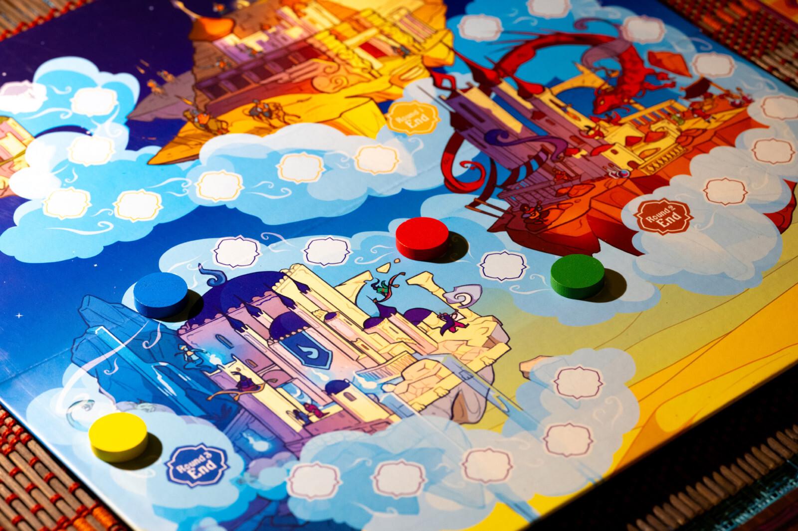 The Bazaars of Ubar is a fantastical engine-building game that takes players to the mythical marketplaces of Ubar – the Atlantis of the Sands! Draft trade tiles from a common area, paying for them with time, in a marketplace where the costs shift like the sands from game to game. Make clever use of tradewinds to activate your drafted tiles again and again. Manage the space on your ship to carry only the most precious cargo as you make your way to floating bazaars to sell your goods. Watch for fluctuating values in the markets to make sure your goods bring in the most gold and ensure your victory as the shrewdest trader in The Bazaars of Ubar!During setup, Trade tiles are laid out in a grid in the center of the table. On a player's turn, they take a trade tile from the center area and, paying a time cost for it. The time cost is spent by moving their ship along the path toward the next bazaar.After taking a trade tile, a player adds it to their tableau adjacent to previously taken tiles – activating the newly taken tile and previously taken tiles in their tableau according to the direction of the trade winds on their tile. Trade tiles allow players to earn new goods from the supply or trade goods they already have for more desirable goods.When a player's ship reaches a bazaar, they may sell any number of the goods they have in their ship (to marketplaces with fluctuating values that vary from game to game). When all players have reached a bazaar, the trade tiles in the center are cleared and a new grid of trade tiles created.When all players have reached the third bazaar, the game ends and the player with the most gold from selling their goods wins!*Features:** 2–4 Players* 45–75mins* Ages 10+