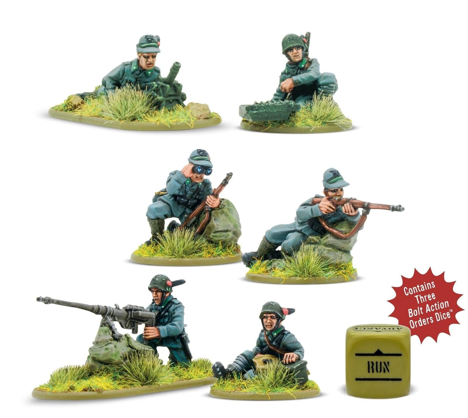 Infantry weapons teams are a key component of any Bolt Action army, providing great tactical flexibility for your force. This boxed set provides your Italian Alpini army with three of the most prevalent and useful such teams, as well as Bolt Action Order Dice to field them, arming you with the tools to tackle a variety of battlefield situations, and presenting your opponent with multiple challenges to overcome. It contains:_Anti-Tank Team (0–1 per Rifle Platoon or 0–3 per Heavy Weapons Platoon):_The Solothurn anti-tank rifle was a cross between a true anti-tank rifle and a light anti-tank gun. Anti-tank teams are ideally suited for hunting lighter enemy vehicles, like transports, armoured cars and light tanks._Sniper Team (0–1 per Rifle Platoon):_The Italian army had no specialist sniper rifle, but a skilled marksman could make any scoped rifle deadly enough. In Bolt Action, snipers are accurate, long-range weapons that deny their targets the benefits of cover, and can pick out enemy squad leaders and NCOs from within a squad._Light Mortar Team (0–2 per Rifle Platoon or 0–5 per Heavy Weapons Platoon):_The Brixia 45mm light mortar was a powerful and successful weapon in the hands of properly trained soldiers. Light mortars lob shells high over the field, at a relatively short range. Though they are inaccurate at first (not that a lucky six won’t result in an early hit!) they get more accurate as they range in, provided the target stays put! They are also capable of firing smoke shells to lay down a smoke screen for your troops as they advance.*Contents:** Six Warlord Resin Italian Alpini figures,* Three Bolt Action Order dice, and plastic bases.