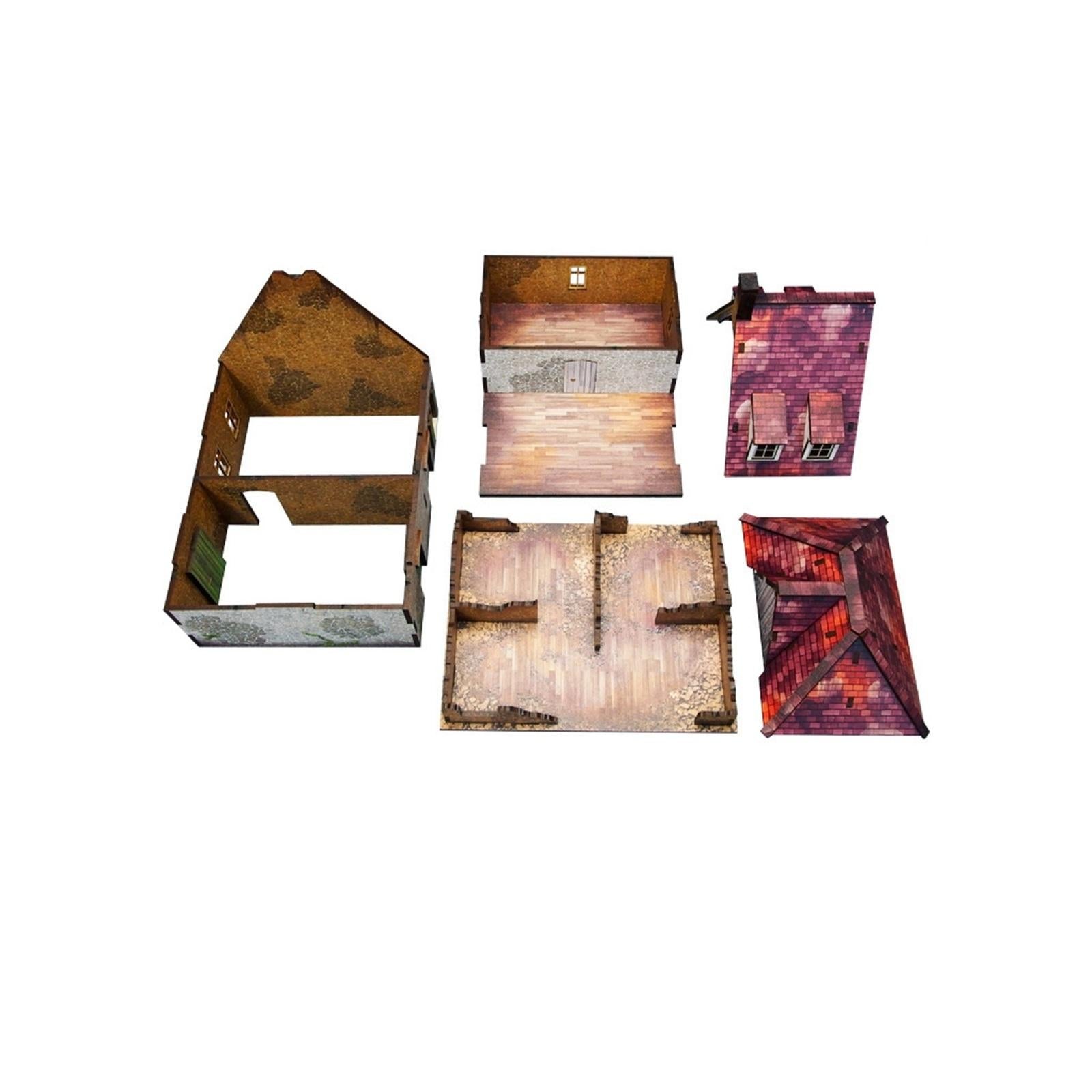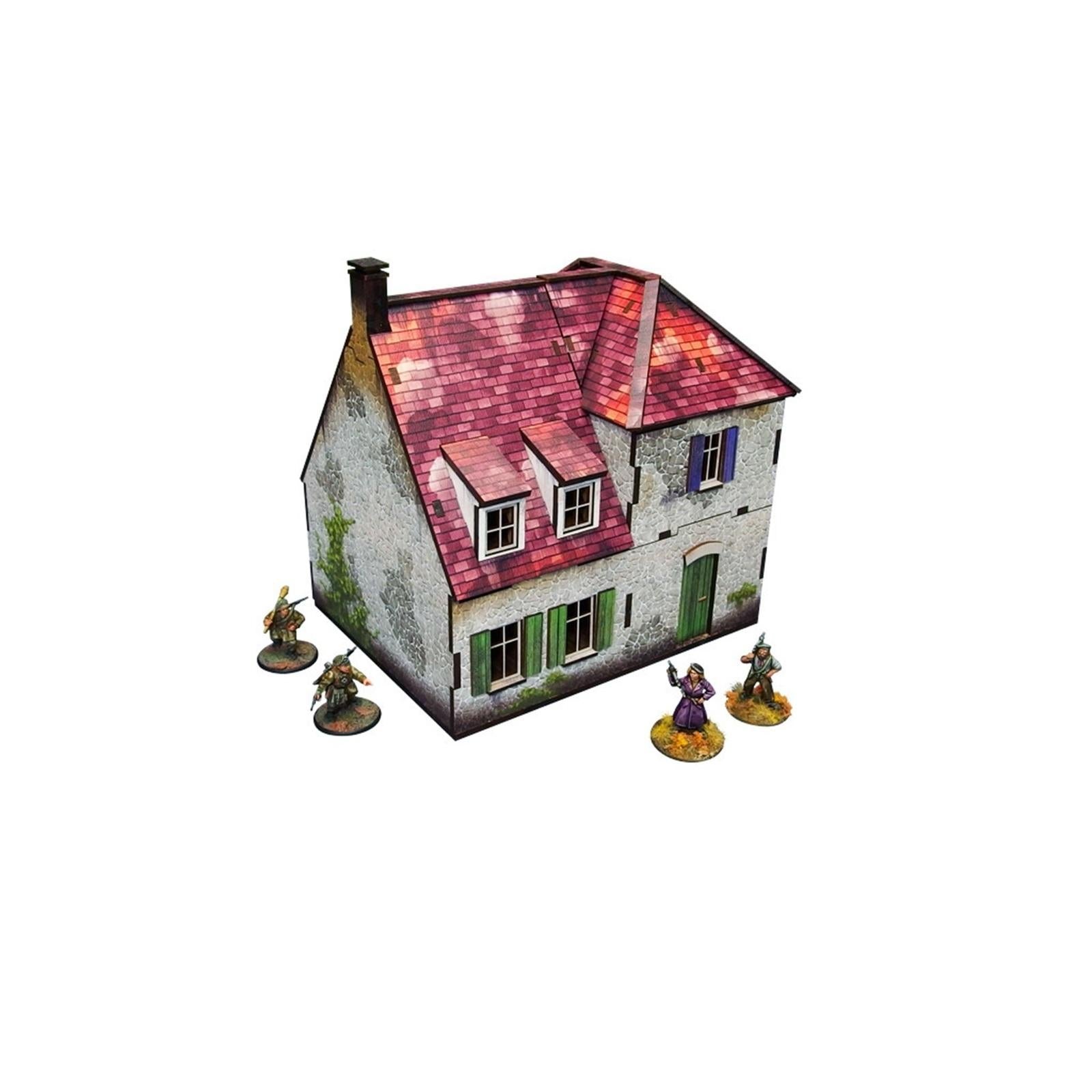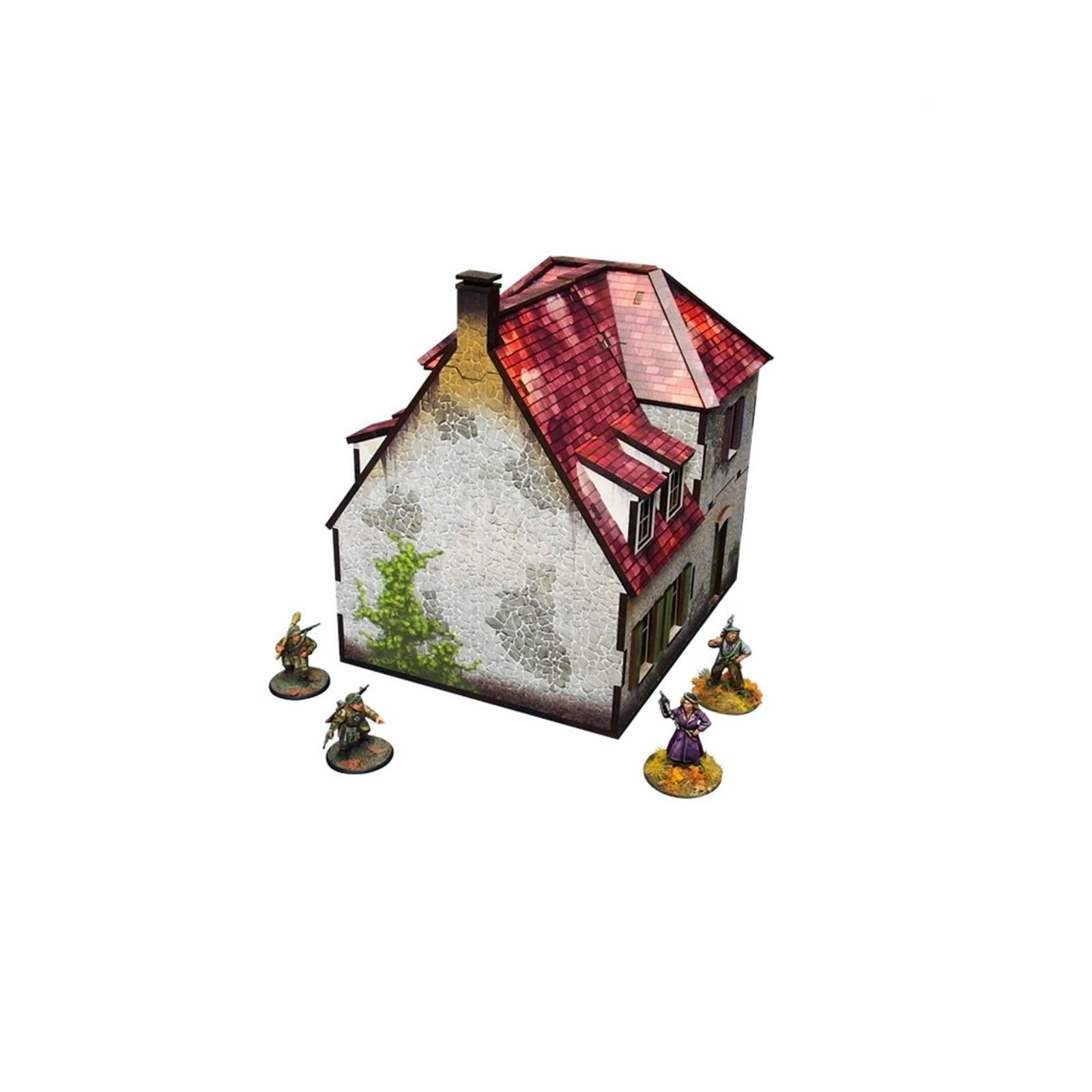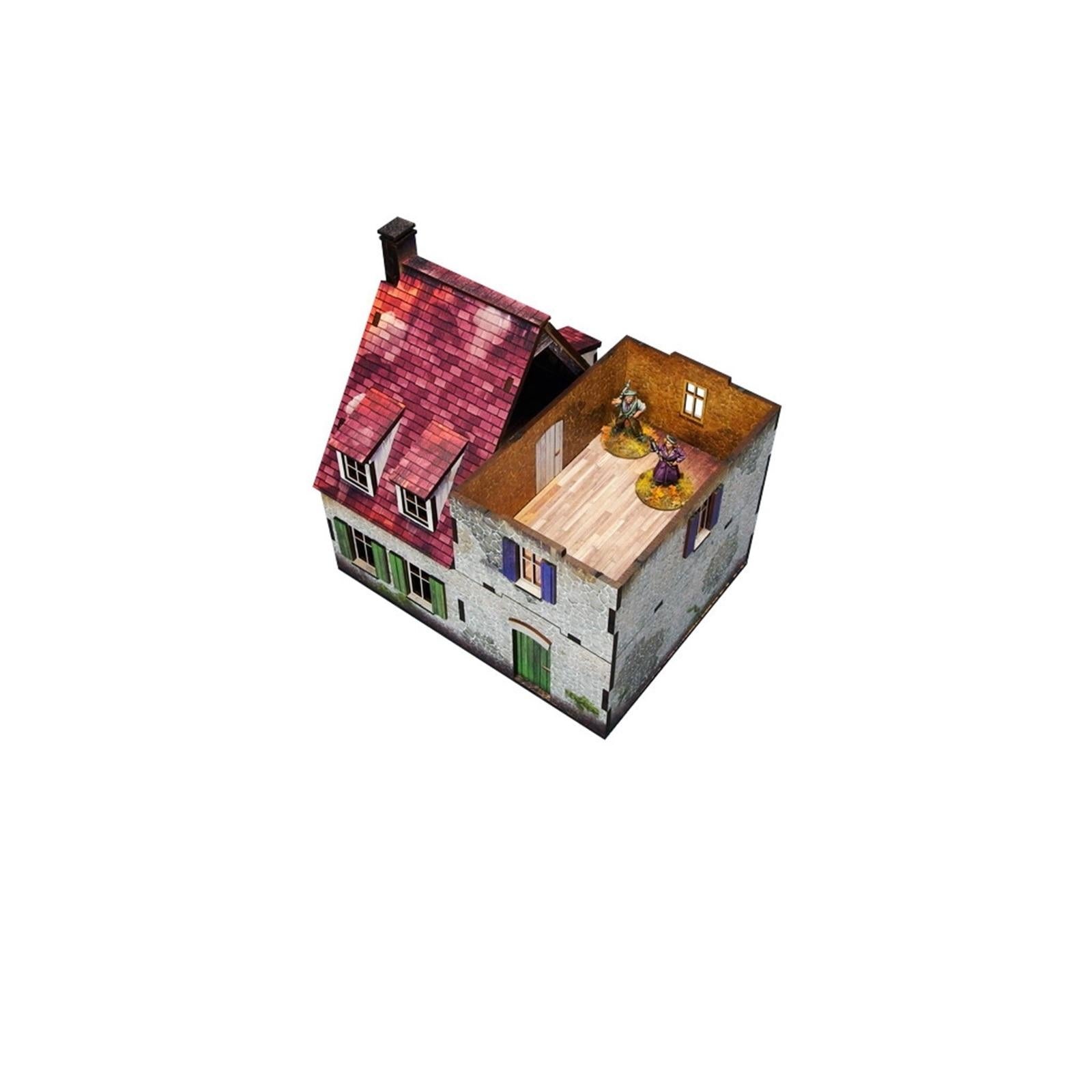 Multicolour pre-painted (UV-printed) 2-level WW2 Normandy Farmhouse building with accessible colourful interiors, removable levels, and removable ruined ground floor. Room to fit in a whole infantry squad inside. Pre-cut acrylic transparent windowpanes included. Option to assemble with open or closed shutters and doors.*Specifications:** Length: 16cm / 6,3in* Width: 12,5cm / 4,9in* Height: 15cm / 5,9in* Scale: 28–30mm / 1:56This model is delivered as a pack, unassembled and PREPAINTED.Every model is cut from one or more panels of HDF (high-density fibreboard) of 3mm and/or 1,5mm thickness.WW2 series scenery might prove demanding to assemble, dry fit parts before applying the glue to avoid mistakes. PVA (white) glue recommended._Please Note: Before taking the elements out make sure they are fully cut. There are minor connections that prevent them from falling out. Parts are secured with a layer of protection paper, please remove it gently before assembly. Tiny paint chips may occur when removing the protective layer, if this happens, use colour marker or hobby paint to mask them.__Please Note: Miniatures are not included – used for scale only._
