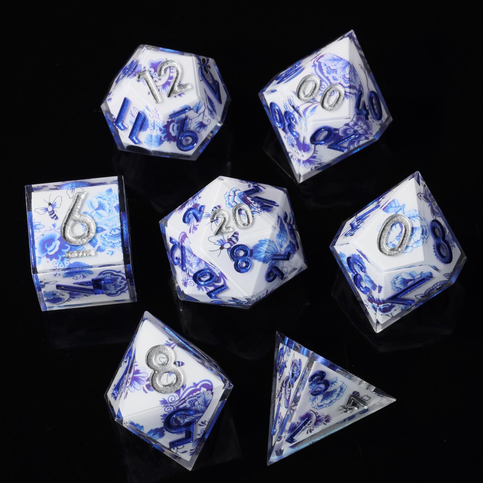*Dudley's Gallery – Porcelain Beauty Sharp Edge Resin Dice Set**Crafted from high-quality resin*Each die boasts sharp edges and delicate colours inspired by the timeless beauty of porcelain. As part of Dudley the dragon's exclusive gallery collection, these resin dice bring not only precision to your rolls but also the sophistication of a dragon's treasure.*Sharp Edge Resin Craftsmanship:*Each die is meticulously crafted with sharp edges, ensuring a distinct look and feel that enhances your gaming experience.*Delicate Colours:*Each die features soft and elegant colours reminiscent of fine porcelain, adding a touch of sophistication and beauty to your table top adventures.*Gallery Collection:*This set is part of Dudley's prestigious gallery collection, ensuring that each die is a work of art worthy of display.*Versatile Use:*Ideal for a variety of table top games, RPGs, and D&D campaigns. Whether you're a dungeon master or a player, Dudley's Porcelain Beauty Dice Set will enhance your gaming experience.*Easy-to-Read Numbers*Each die features large, easy-to-read numbers, ensuring quick and hassle-free gameplay.*Packaging:*Each set comes elegantly packaged in a sturdy and reusable storage box, ensuring your dice are safely stored and ready for your next gaming adventure.*Dudley's Generosity:*Imagine the elegance as you roll Dudley's Porcelain Beauty Sharp Edge Resin Dice Set, a treasure from his prestigious gallery collection. Let the magic of dragons infuse your gameplay as you immerse yourself in the timeless beauty of fine porcelain with each roll.Want to display this beautiful set the right way? Check out the *[BrickFans Premium Dice Display Case](https://www.mightyape.co.nz/product/brickfans-premium-dice-display-case/39153460)**Technical Specifications**_Set Includes:_*1 x D4 (Four-sided die)1 x D6 (Six-sided die)1 x D8 (Eight-sided die)1 x D10 (Ten-sided die)1 x D10 percentile (Ten-sided die marked in tens)1 x D12 (Twelve-sided die)1 x D20 (Twenty-sided die)1 x Storage Box*_Note: As each die is crafted from resin, slight variations in colour and pattern may occur, adding to the unique charm of each set._*