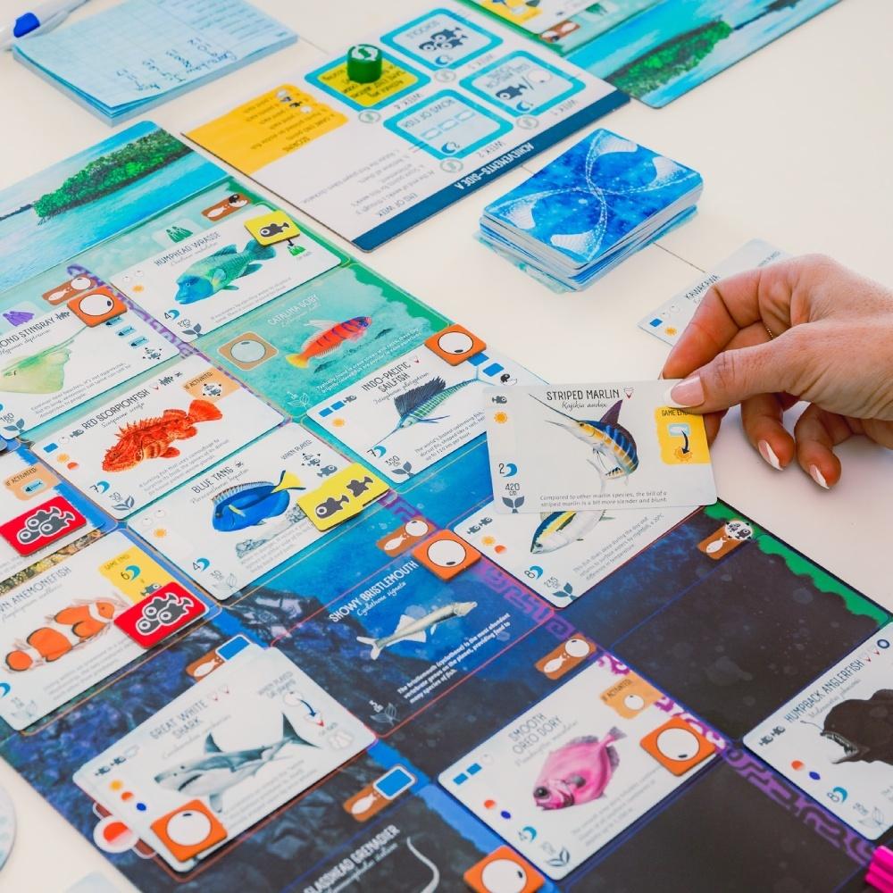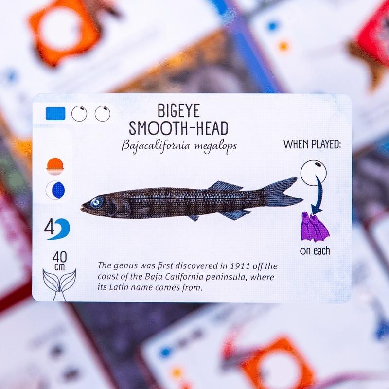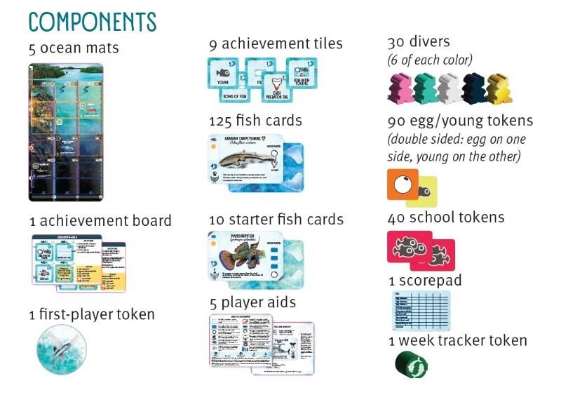 The World of Wingspan just got a lot bigger with the addition of Finspan!You are a marine researcher seeking to find and observe an array of aquatic life in the colorful Sunlight Zone, ghostly Twilight Zone, and pitch-black Midnight Zone of the world’s seas and oceans. In Finspan, the fish you discover over 4 weeks will generate a series of benefits as you dive deeper into the ocean.Each dive site specializes in a key aspect of expanding your research:* Grow your collection of fish.* Discover freshly laid eggs.* Hatch eggs into young and consolidate young to form schools.* The winner is the player with the most points gained from fish, eggs, young, schools, and achievements.*Features:** Players: 1–5* Playtime: 45–60 Minutes* Ages: 10+*Contents:** 5× Ocean Mats* 9× Achievement Tiles* 125× Fish Cards* 30× Diver Tokens* 90× Egg/Young Tokens* 1× Achievement Board* 10× Starter Fish* 40× School Tokens* 1× First-player Token* 5× Player Aids* 1× Scorepad* 1× Week Tracker Token