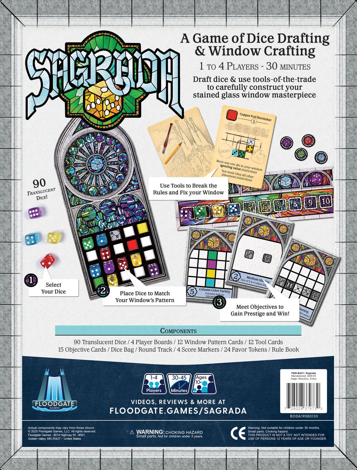 *Draft dice and use the tools of the trade in Sagrada to carefully construct your stained glass window masterpiece.*In more detail, each player builds a stained glass window by building up a grid of dice on their player board. Each board has some restrictions on which colour or shade (value) of the die can be placed there. Dice of the same shade or colour may never be placed next to each other. Dice are drafted in player order, with the start player rotating each round, snaking back around after the last player drafts two dice. Scoring is variable per game based on achieving various patterns and varieties of placement…as well as bonus points for dark shades of a particular hidden goal colour.Special tools can be used to help you break the rules by spending skill tokens; once a tool is used, it then requires more skill tokens for the next player to use them.The highest scoring window artisan wins!*The Dice Tower Seal of Excellence is a trademark of The Dice Tower, LLC and is used with permission.*