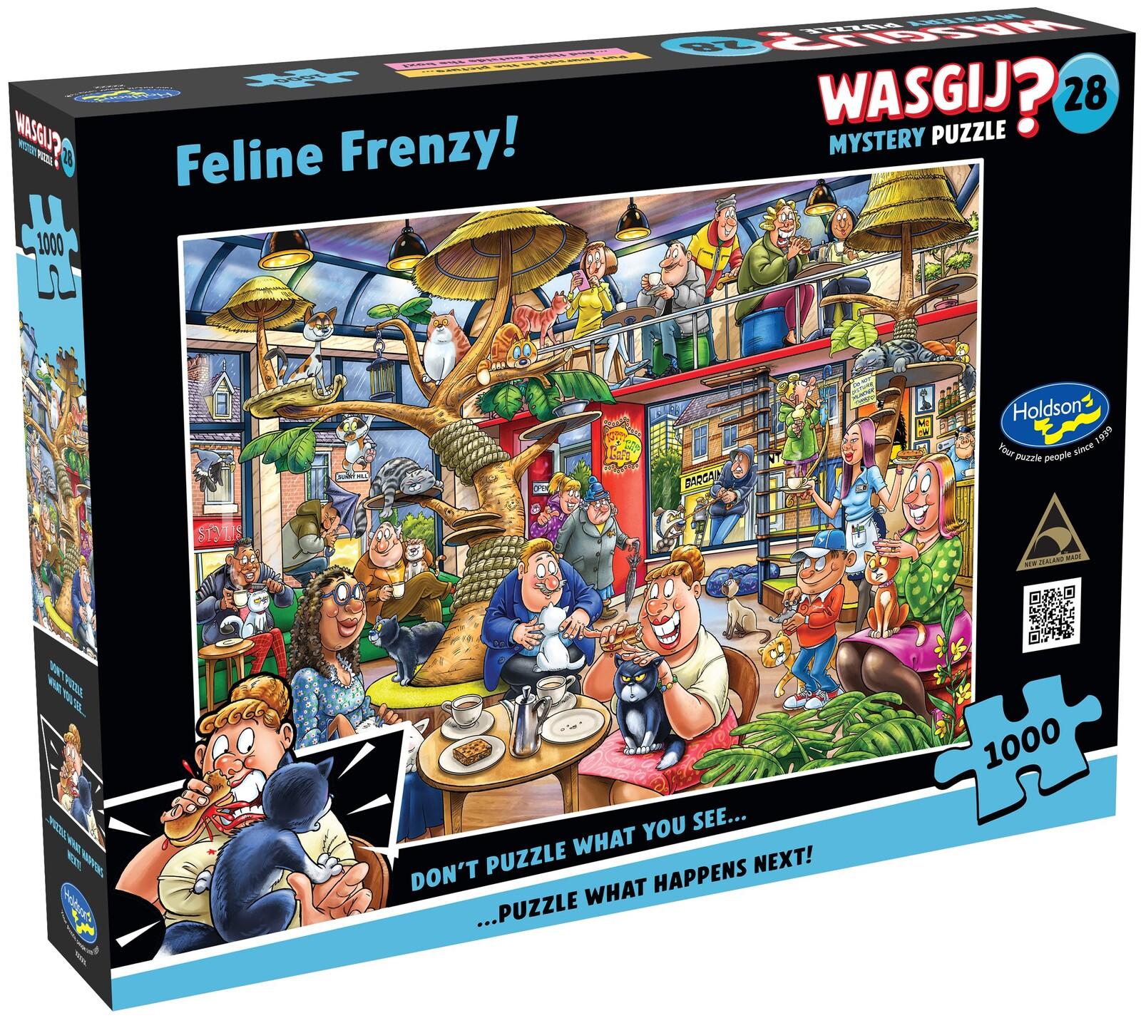 Wasgij Mystery, is the hilarious puzzle concept where the image on the box is simply a clue to the puzzle inside. Cats of all kinds welcome visitors to the Cat Café, an oasis where you while away an hour sipping coffee with a friendly moggy on your lap. One little boy has other ideas, are the cats too confortable to care, or will his mechanical mouse cause mayhem. What happens next?*Features:** Approximate puzzle size 688×493mm.* Manufactured in New Zealand by Holdson using vegetable based inks and recyclable materials.*Suitable for ages 8 years and up.*