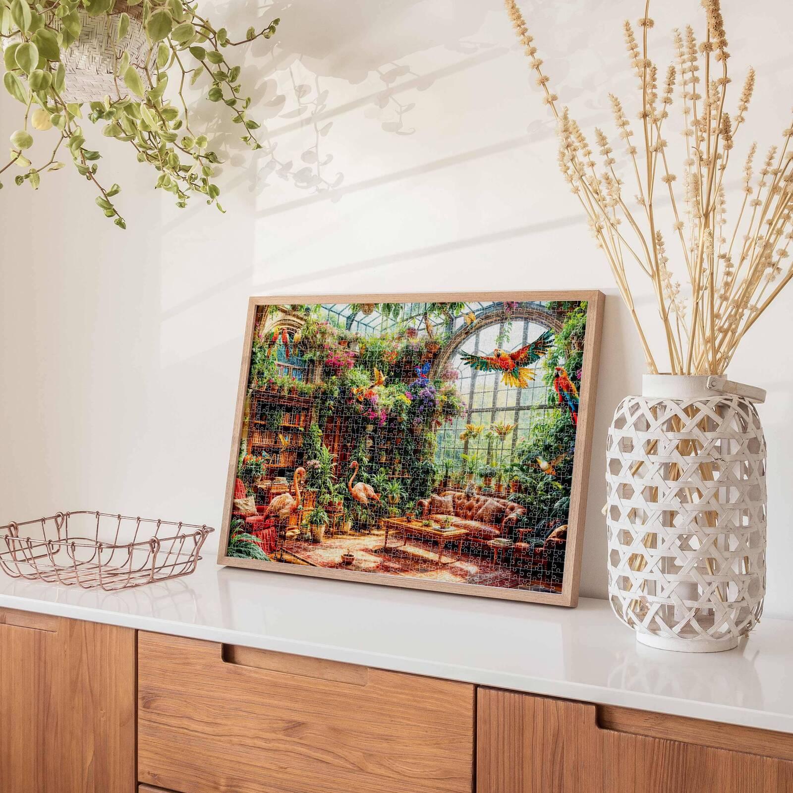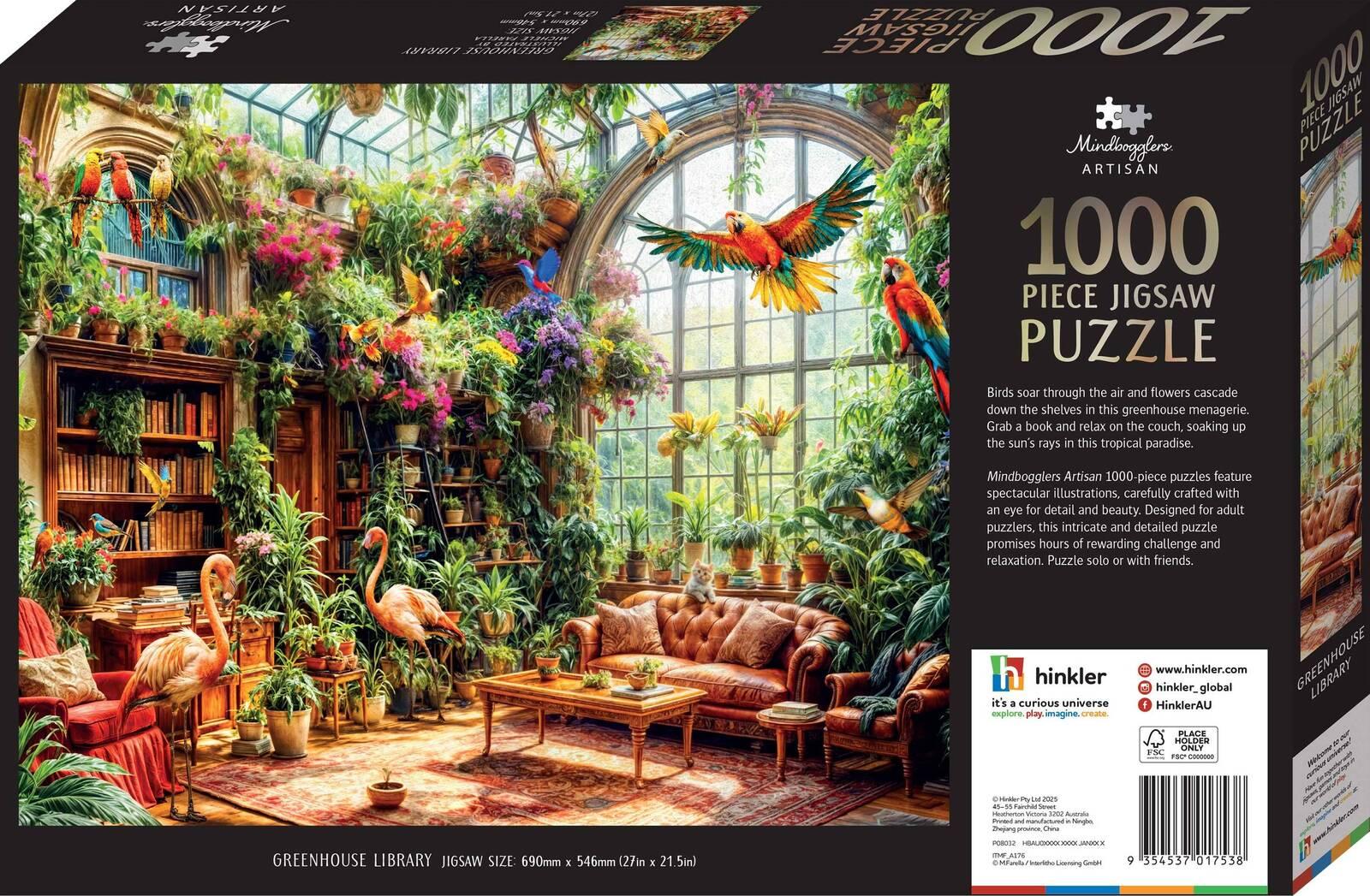 Step into a tranquil haven with the Mindbogglers Artisan 1000pc Jigsaw Greenhouse Library.This captivating puzzle features a serene scene of reading nook nestled within a lush greenhouse, where sunlight filters through verdant leaves, creating a peaceful atmosphere perfect for unwinding.*Features:** 1000 Pieces of high quality puzzle* A stunning picture to put together* The perfect way to relax