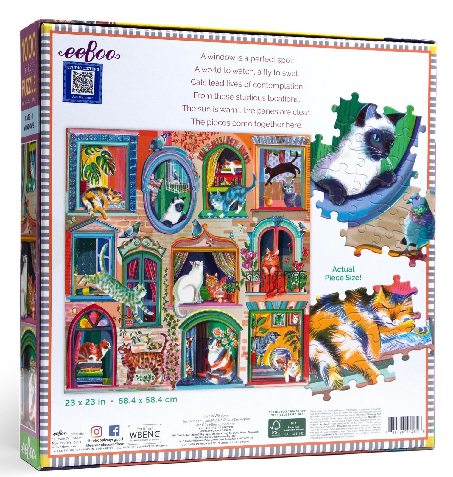 *eeBoo: 1,000-Piece Jigsaw Puzzle – Piece & Love: Cats In Window*Cats in Windows, 1000 Piece Jigsaw Puzzle. Artist Asta Barrington's original illustration of wandering, colorful cats combine to create a portrait of a day of rest, exploration, mischief, and quiet curiosity.*Features:** A high-quality jigsaw puzzle for adults and families* With glossy, sturdy pieces and minimal puzzle dust* Made with recycled board and printed on FSC-certified paper.* Completed Dimensions – 23 inches x 23 inches.* Piece Count: 1000 glossy pieces.* Includes colour insert.*Suitable for ages 14 & up*