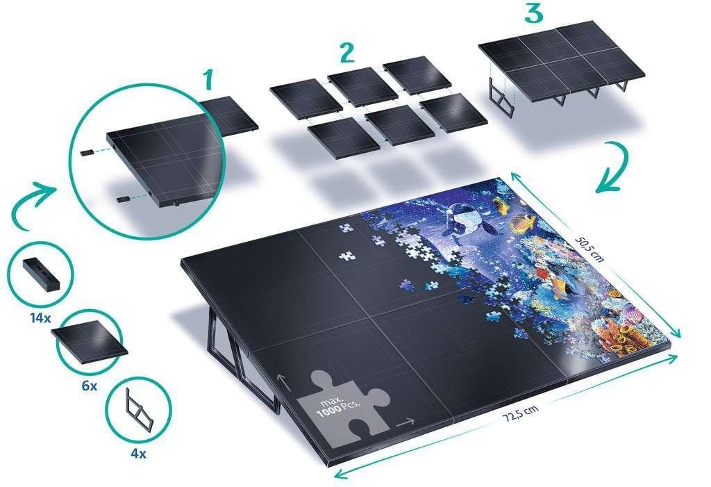 Puzzle at a comfortable angle!The perfect puzzle accessory! This jigsaw puzzle makes it more relaxing to put together jigsaw puzzles. The non-slip surface prevents the pieces from falling off and the ergonomic angle reduces strain on the neck. It is made of 98% recycled plastic which is super light for easy transport. Perfect for Ravensburger 1000 puzzle in landscape format. 98% recycled material, Non-slip surface, Easy transport and storage,Specially developed for Ravensburger 1000 puzzles (72 × 51 cm).
