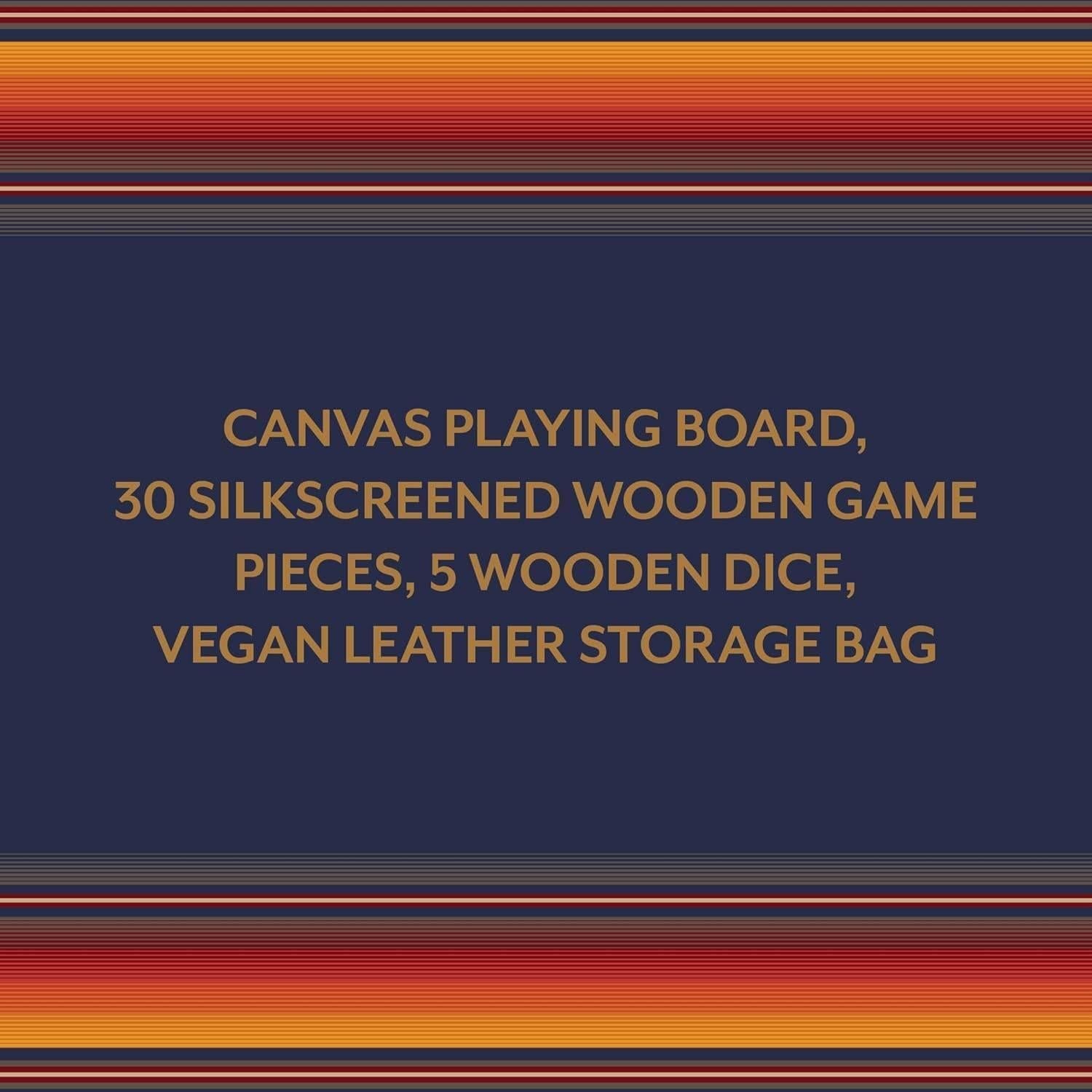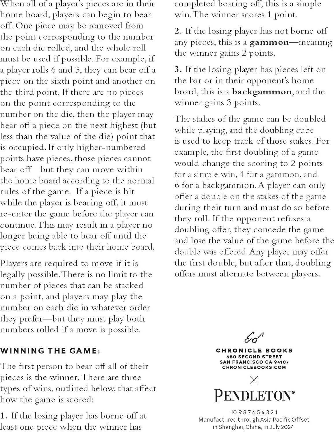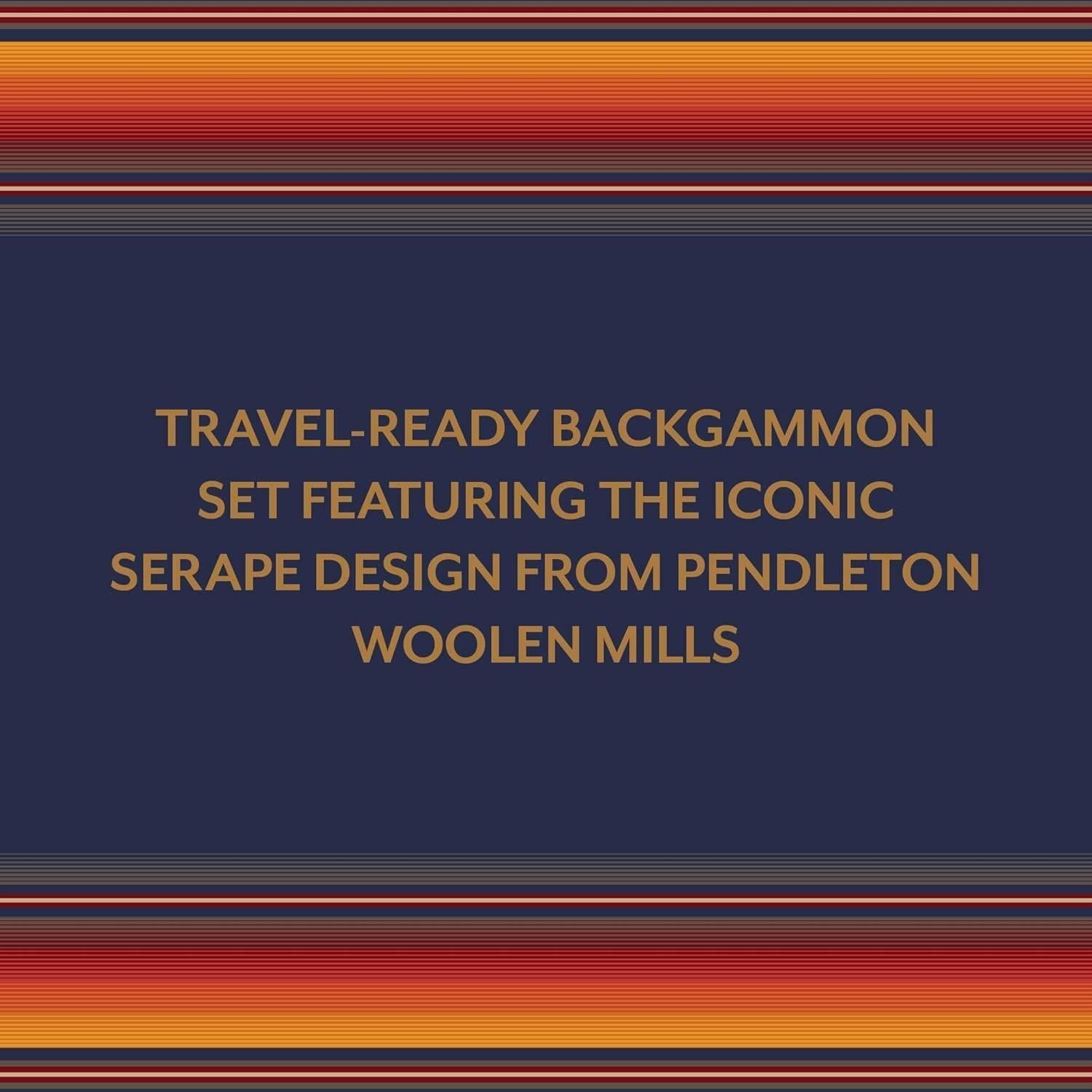 This travel-ready backgammon set from the iconic Pendleton brand features a beautifully designed canvas board and snap-on vegan leather pouch for storing pieces. Backgammon is a classic family game—now it's easy to bring anywhere. Combining convenience with style, this set rolls up just like a Pendleton blanket for swift storage and easy travel.The Pendleton brand has a 150-year heritage, and its products are made with time-honored quality and craftsmanship. This is an easy gift for holidays, housewarmings, Mother's Day, Father's Day, or for recent graduates embarking on a new adventure or people who love to travel and camp. Fans of the Pendleton brand; Southwest-inspired print and art enthusiasts; gift for couples and families who enjoy camping and traveling together; family game night; Pendleton shoppers looking for attractive presents for family and friends.*Features:** 2 Players* 10–20mins* Ages 3+