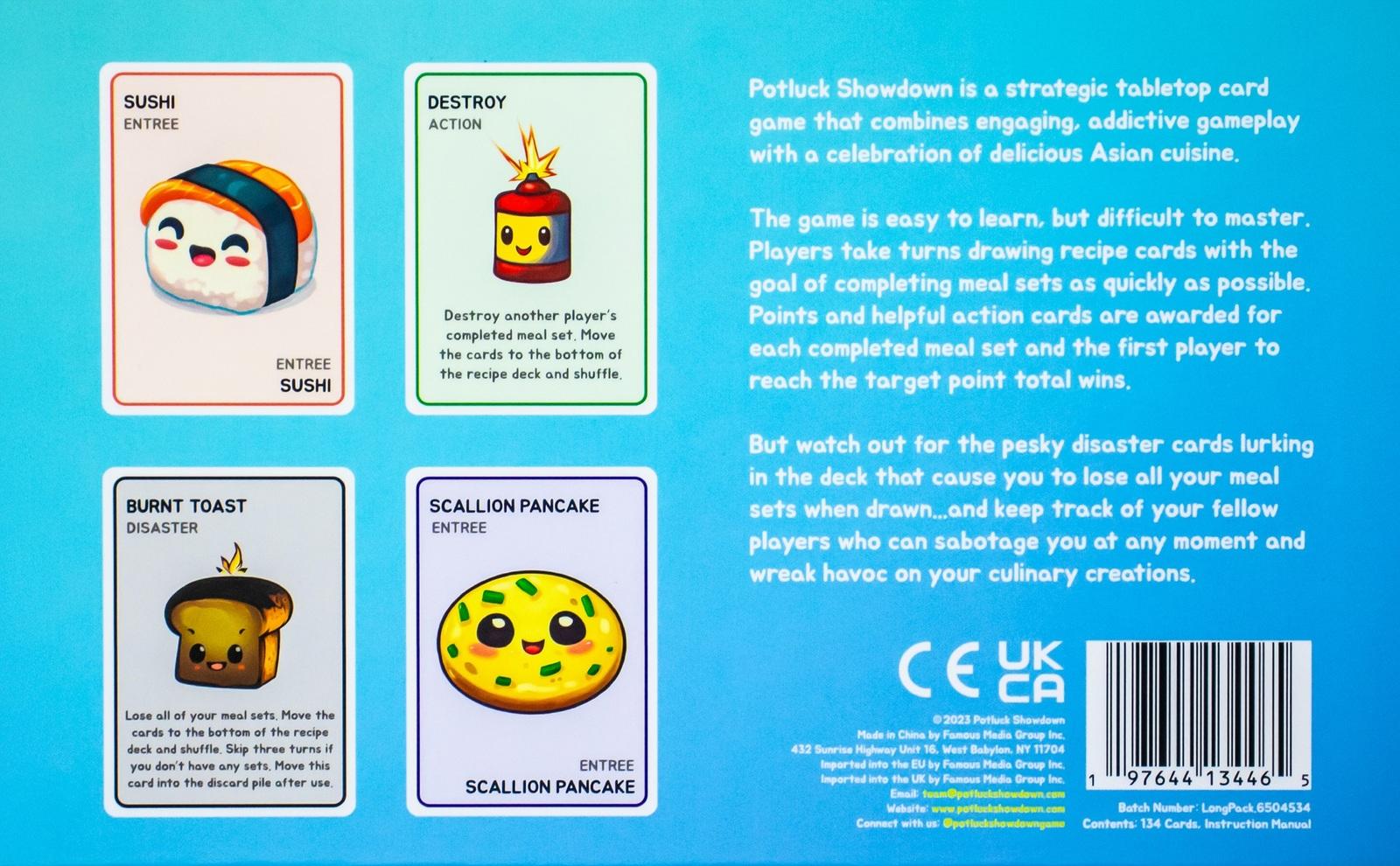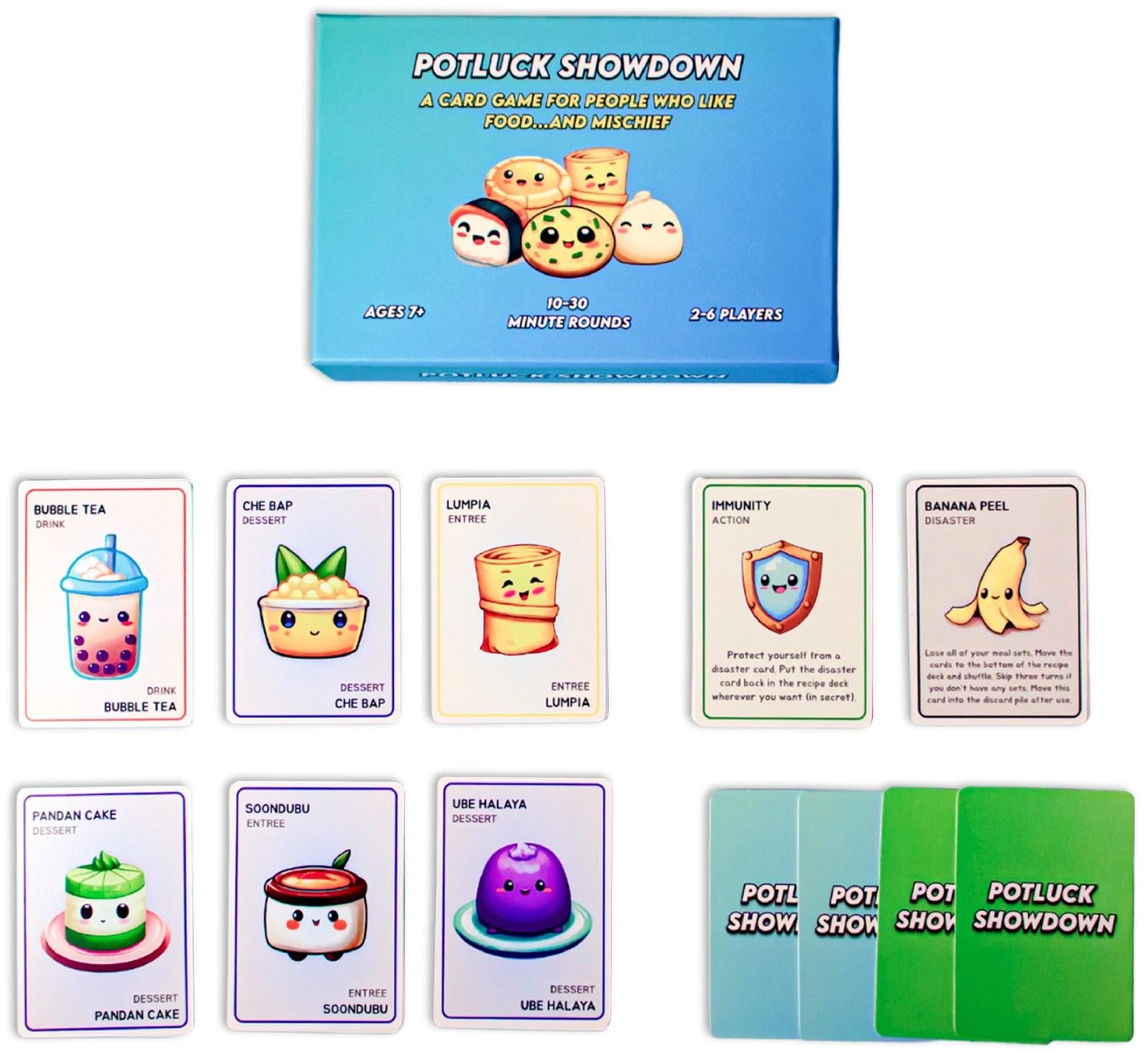 Potluck Showdown is a strategic tabletop card game that combines engaging, addictive gameplay with an appreciation for delicious Asian cuisine.The game is easy to learn, but difficult to master. Each player starts with a hand of recipe cards and must complete meal sets (drink, entree, and dessert) to acquire points and win. But, as you play, watch out for the action and disaster cards that can wreak havoc on your culinary creations.With over 30 diverse Asian foods represented, there's plenty of variety to keep the game fresh and exciting. Plus, the adorable artwork on each card will make you smile no matter the occasion.Perfect for gatherings with family, a hangout with friends, or a game night with the kids.*Features:** Players: 2–6* Playtime: 10–30 Minutes* Ages: 7+