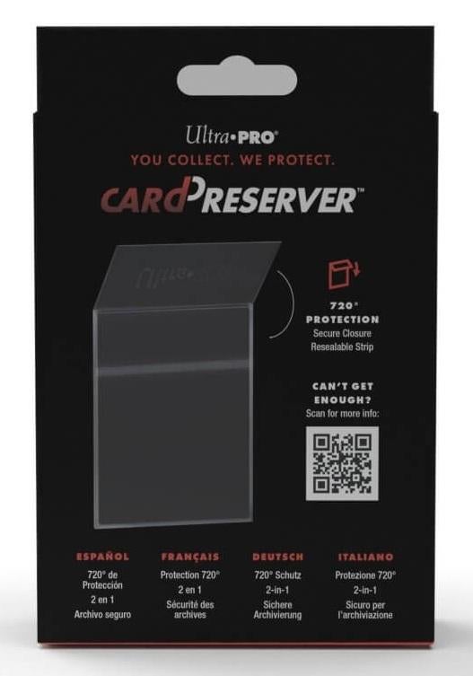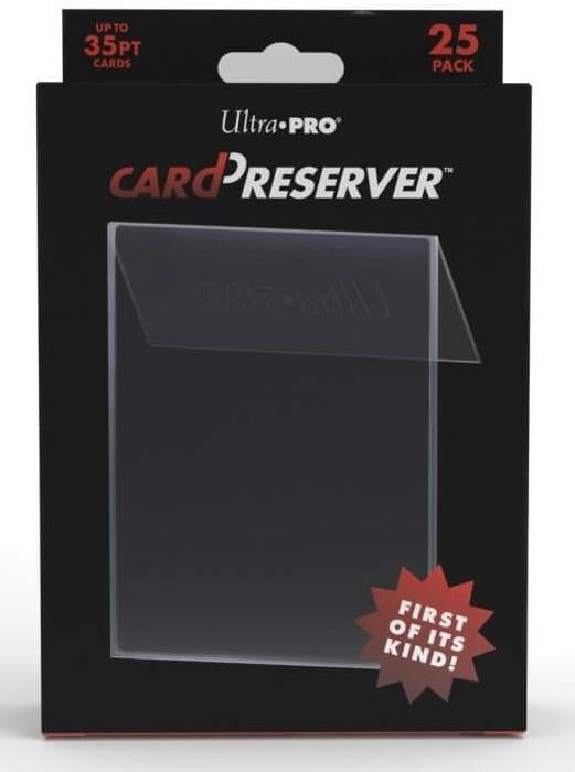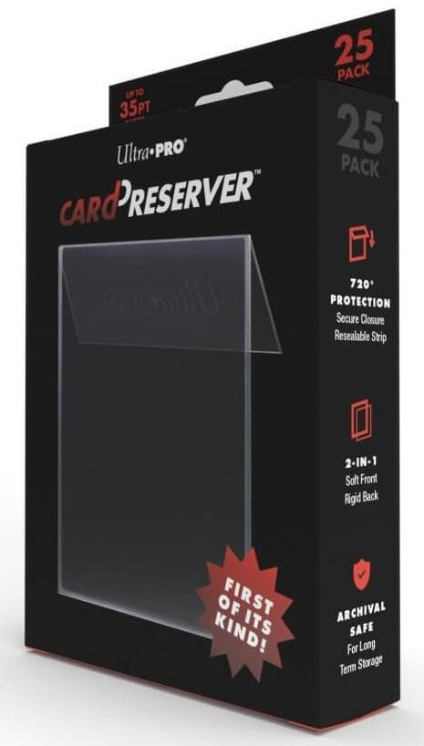 *Ultra PRO’s revolutionary CardPreserver™ protective holders provide trading card security and long-term storage with a built-in, 2-in-1 benefit.*CardPreserver protective holders feature a soft front for easy card loading and a rigid back to help prevent damage. These amazing protective holders offer a safe method of archival storage for trading cards based on their 100% acid-free, polypropylene construction. Additionally, these industry-changing protective holders also feature a resealable back to keep your cards in place for full 720° security.*Details:** 2-in-1 protective holder combines soft-loading front with semi-rigid back* Archival safe 100% polypropylene construction* 720° security* Accommodates most standard size trading cards up to 35-point* Resealable flap for multiple uses*_This is for a pack of 25 individual units, not just a Single Preserver._*