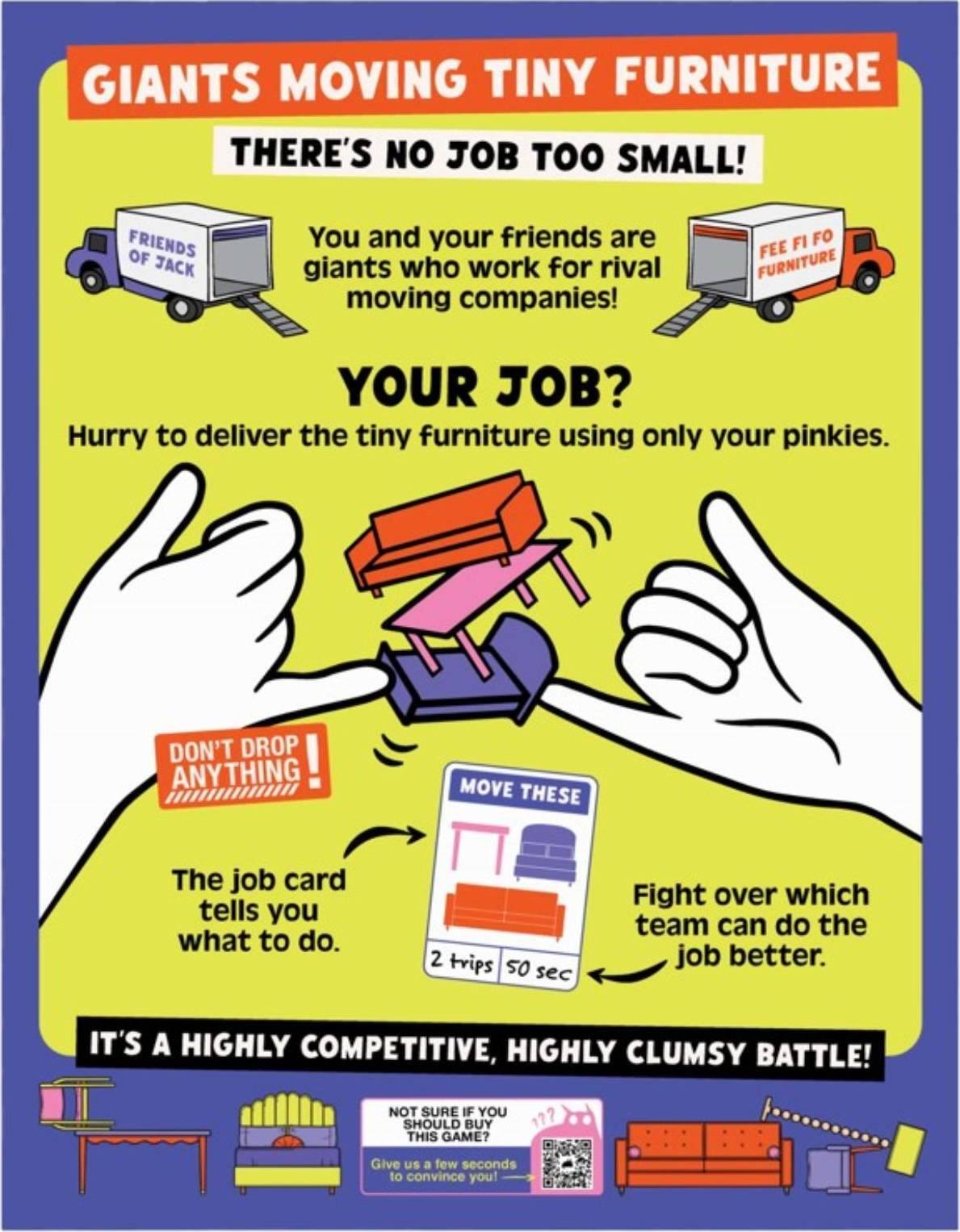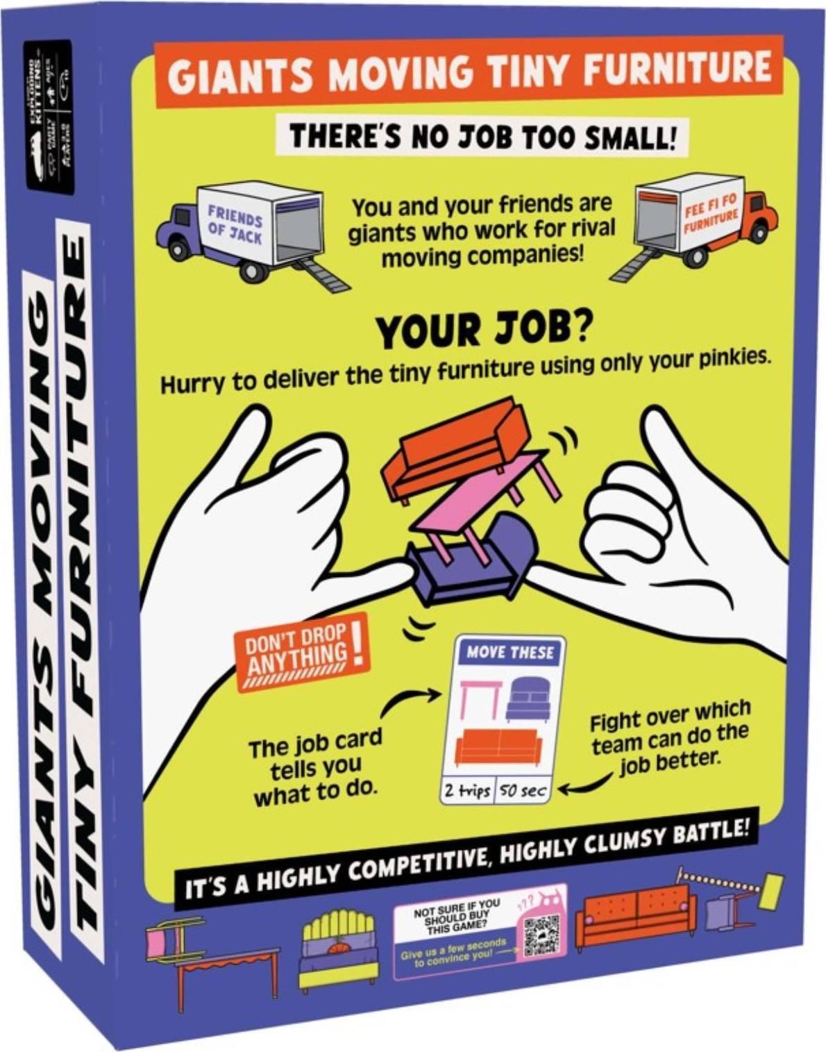 You and your friends are giants who work for rival moving companies. Your job?Hurry to deliver the tiny furniture using only your pinkies. The job card tells you what to do, you then fight over which team can do the job better! It's a highly competitive, highly clumsy battle!*Features:** 3–8 Players* 10mins* Ages 7+