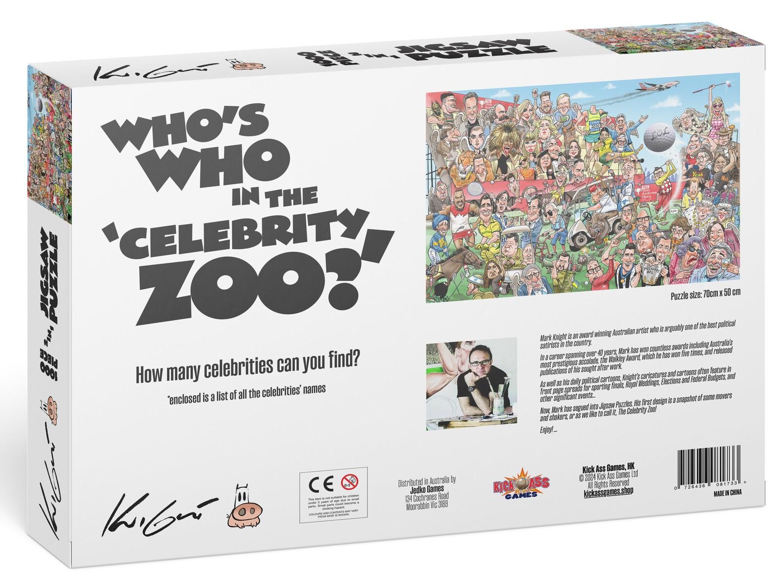 Who's Who in the Celebrity Zoo? Mark Knight is an award-winning Australian artist who is arguably one of the best political satirists in the country. As well as his daily political cartoons, Knight's caricatures and cartons often feature in front page spreads for sporting finals, royal weddings and federal budgets, and other significant events. Mark's first jigsaw design is this snapshot of some movers and shakers, or as we like to call it, The Celebrity Zoo!From the award-winning artist, Mark Knight, comes the Celebrity Zoo series of Jigsaw Puzzles.First you make the puzzle, then you have to work out who each celebrity is?Can you name them all?To help, there is a legend inside the box identifying all the celebrities in the puzzle.
