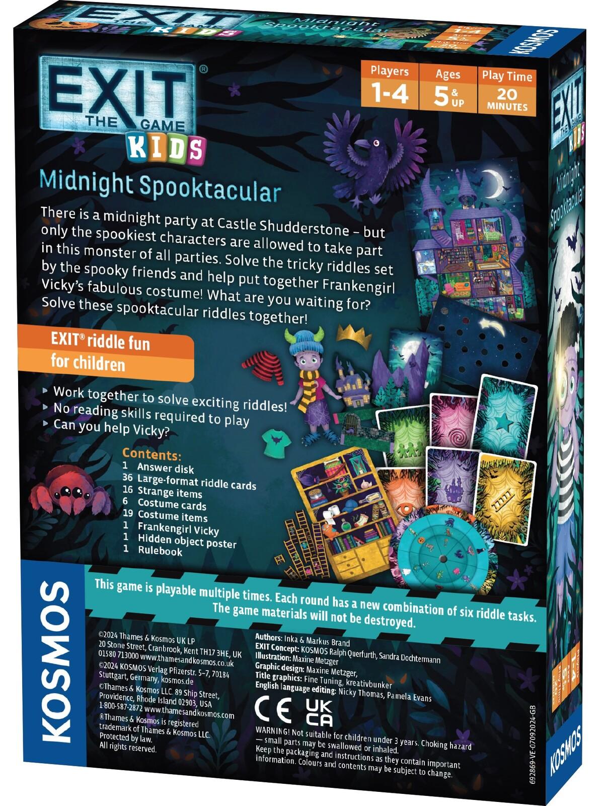 *Exit the Game: Kids – Midnight Spooktacular*There is a costume party at Castle Shudderstone – but only the scariest characters are allowed to take part in this monster of all parties. Solve the tricky riddles set by the spooky friends and help put together Frankengirl Vicky’s fabulous costume! What are you waiting for? Solve these spooky riddles together!*Features:** Players: 1–4* Playtime: 20 mins* Ages: 5+