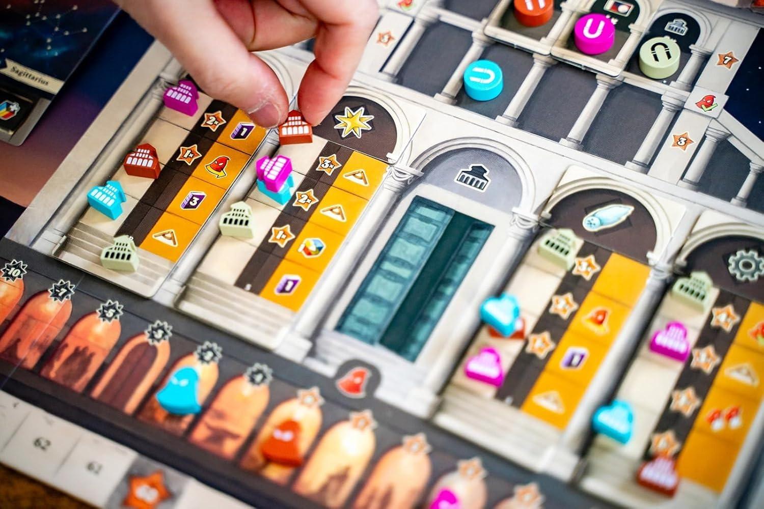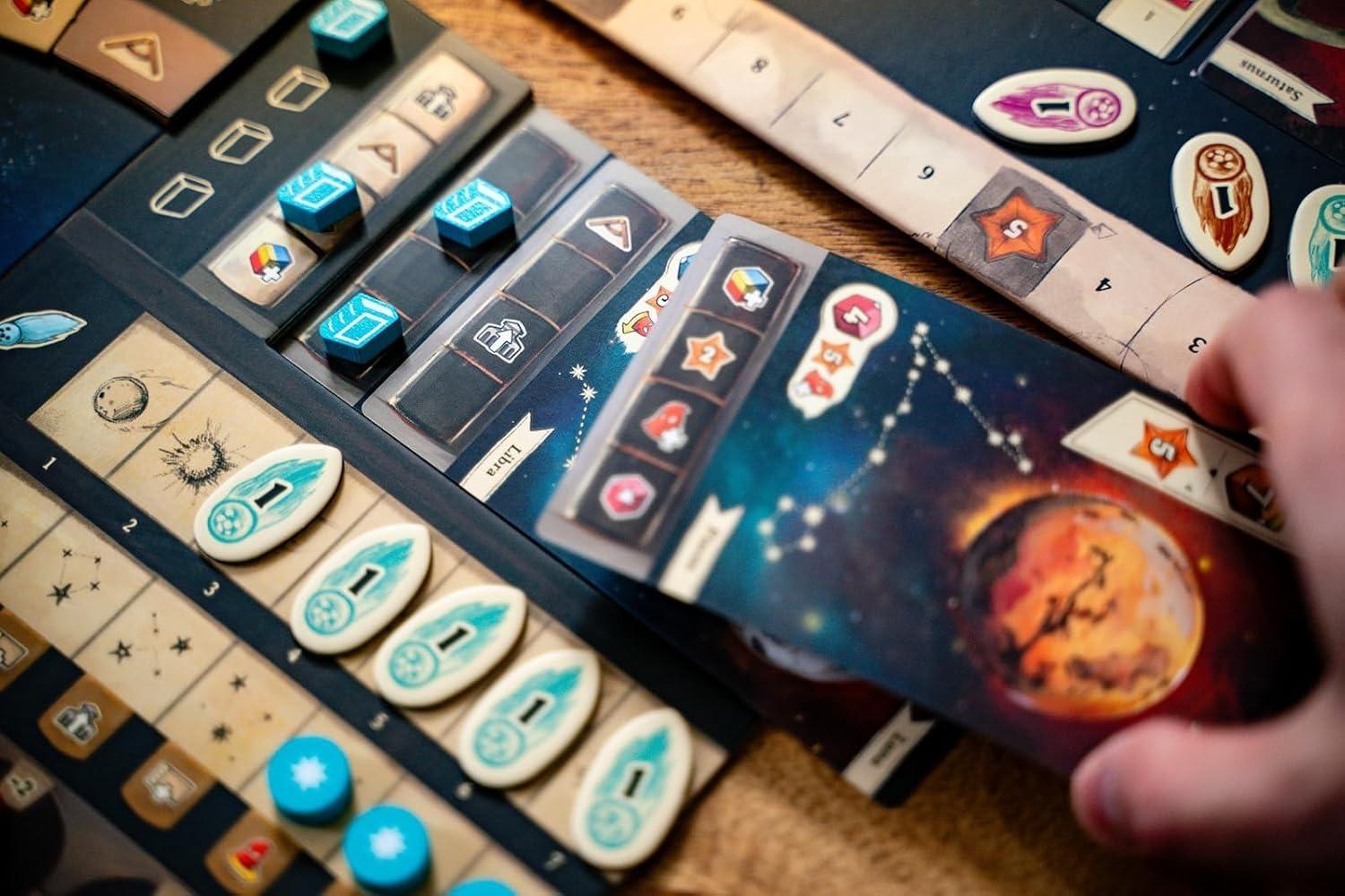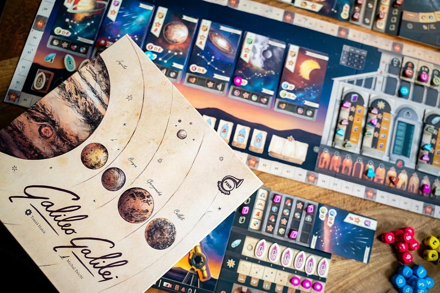*Galileo Galilei*“And yet it moves”, he said. Galileo Galilei is a Euro-style game in which you take on the role of an astronomer who will discover new planets, find unknown star systems, develop their telescope, and make a scientific breakthrough in the difficult ages of obscurantism.Use your telescope to select one of the five actions available, with you being able to evolve these actions into better ones. Collect cards of different planets and star systems. Collect lenses of the three main colors to make a discovery. Be wary of inquisitors as they might arrive unwelcomed and ruin your fame in no time. Better find a way to profit from their visit instead…*Features:** Players: 1–4* Playtime: 60–130 Minutes* Ages: 12+