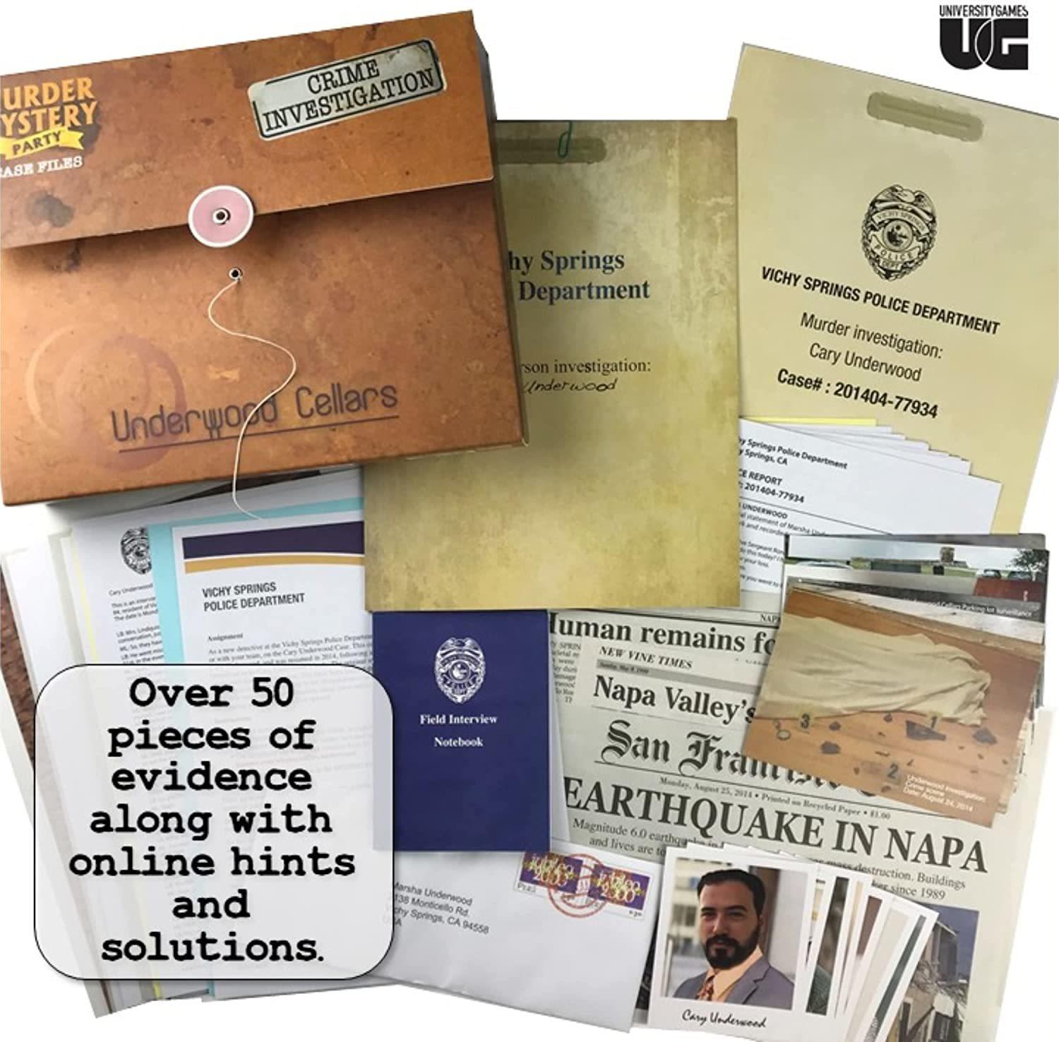 *INVESTIGATE A MURDER IN NAPA VALLEY:* Solve a murder mystery with friends. Open the Underwood Cellars Case File to start the crime scene investigation. It has been 20 years since famed Napa winemaker Cary Underwood disappeared. After the Napa earthquake, Underwood’s murder was uncovered. The hunt is on to find a killer and it’s up to you to solve this wine country murder. This Case File includes all the evidence you need to solve the murder. Review every clue and piece of evidence in this unsolved mystery case file.*IMMERSIVE STORY AND REALISTIC EVIDENCE:* This Case File includes crime scene photos, suspect interviews, newspaper clippings, and much more to help you determine who committed murder. All the evidence has been curated to present the most realistic experience possible (no fake handwriting). This murder mystery game in a box is the perfect gift for friends and family who love mystery board games and is perfect for family game night, an evening with friends or for date night for couples who love cold case murder mysteries. Get your Sherlock on to solve this murder mystery.*AMERICA’S FAVOURITE MURDER MYSTERY PARTY GAME BRAND:* If you are a crime junkie who loves cold-case stories and escape room games, then you’ll love Murder Mystery Party products. University Games first began selling Murder Mystery Party games back in 1985. Today, adults become the detective and dive into realistic case evidence. Like our original Murder Mystery Party games, our Case Files are the perfect game to play in an evening with a dinner party. This mystery in a box is the perfect addition to your game room activities and also makes a great Halloween game.*DETERMINE MOTIVE, MEANS AND OPPORTUNITY:* Do you have the skills to find the killer? Be the detective and crack the case. Players need to hunt through the evidence to find the killer and determine the motive, means and opportunity of each suspect. During a murder investigation, a detective must answer the following 3 questions: 1) Motive: Who had a reason to kill the victim? 2) Means: Who had access to the murder weapon and victim? 3) Opportunity: Who had a chance to kill the victim? Is any particular person unaccounted for (has no alibi) during the time the victim was killed?*ONLINE HINTS AND SOLUTIONS:* If you get stuck anytime during your investigation, you can access misplaced case files online for hints to keep you moving. Once you think you know the solution, access complete solutions online to confirm your suspicions and make an arrest.