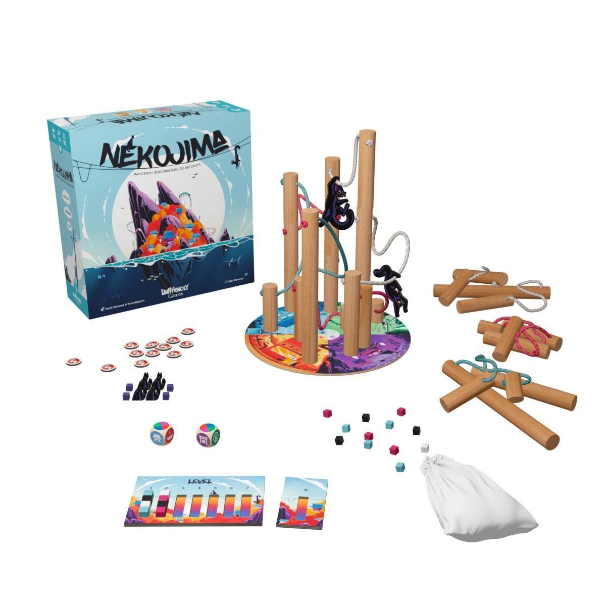 In Nekojima, “The Island of Cats” in Japan, an electricity network is developing to supply the various lively districts of the island. The installation of electric poles becomes more complex due to the narrowness of the territory and its curious population of cats strolling on the cables.Nekojima is a wooden game of skill and dexterity in which you have to keep an entire installation in balance. Players take turns placing or stacking denchuu — 電柱, or electrical poles — respecting the locations without any hanging cables touching. Be careful not to be the one to bring down the structure. This game requires reflection, concentration and skill.In competition, the player who knocks down the structure loses.In co-operation, the goal is to go as far as possible.*Features:** 1–5 Players* 15–30mins* Ages 7+