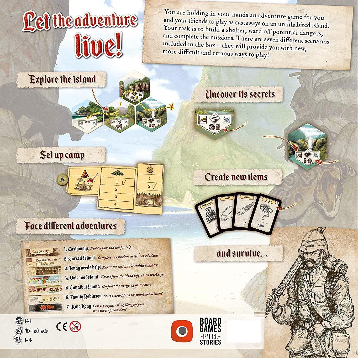 _Robinson Crusoe: Adventure on the Cursed Island is a new epic game from Portal. You will build a shelter, palisade, weapons, you will create tools like axes, knives, sacks, you will do everything you can to… to survive. You will have to find food, fight wild beasts, protect themselves from weather changes._Take on role of one of four characters from the ship crew (cook, carpenter, explorer and soldier) and face the adventure. Use your determination skills to help your team mates, discuss with them your plan and put it into practice. Debate, discuss, work on the best plan you all can make.Search for treasures. Discover mysteries. Follow goals of six different, engaging scenarios. Start from building a big pile of wood and fire it to call for help, and then start new adventures. Become exorcist on cursed Island. Become treasure hunter on Volcano Island. Become a rescue team for a young lady who's stuck on rock island…Let the adventure live!Robinson Crusoe: Adventure on the Cursed Island is an a great co-op game that brings to live emotions from the best novels of Jules Verne and Daniel Defoe. Simple rules are perfectly combined with theme allow players to fully imagine dreadful events that take place on deserted island.*The Dice Tower Seal of Excellence is a trademark of The Dice Tower, LLC and is used with permission.*