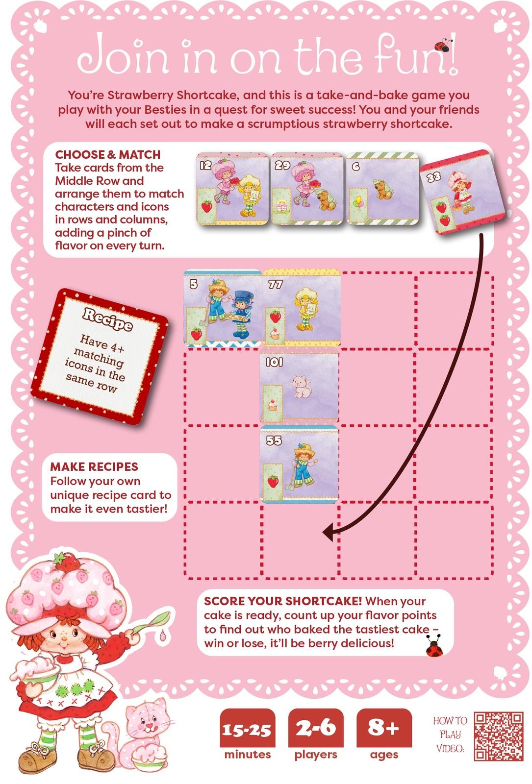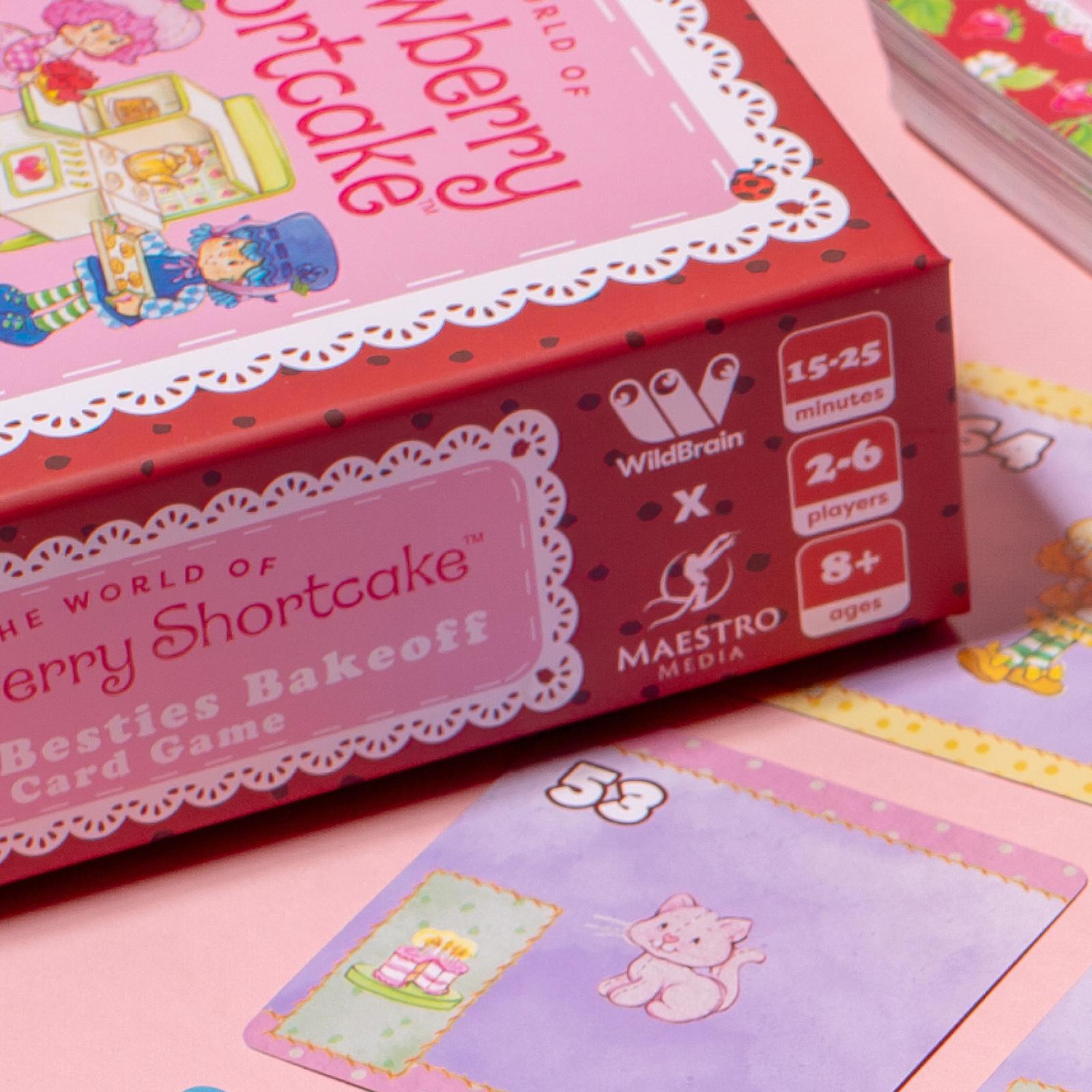 Bid for Strawberry Shortcake characters, then bid on what you paid last time.Embark on a delightful bidding adventure with Strawberry Shortcake, a lively card game filled with charm and excitement. Engage in fun bids for cards featuring beloved characters and items, and use straightforward placement rules to craft lucrative collections. What sets this game apart is its ingenious twist: the cards used in bidding are added to the pool for the next round, adding strategic anticipation to each turn.*Features:** Players: 2–6* Playtime: 15–25 Minutes* Ages: 8+*Contents:** 104× Strawberry Shortcake: Berry Besties Bakeoff Cards* 10× Recipe Cards* 6× Reference Cards* 1× Scented Sticker* 1× BONUS Maestromedia.com Exclusive Scented Sticker* 1× Rulebook