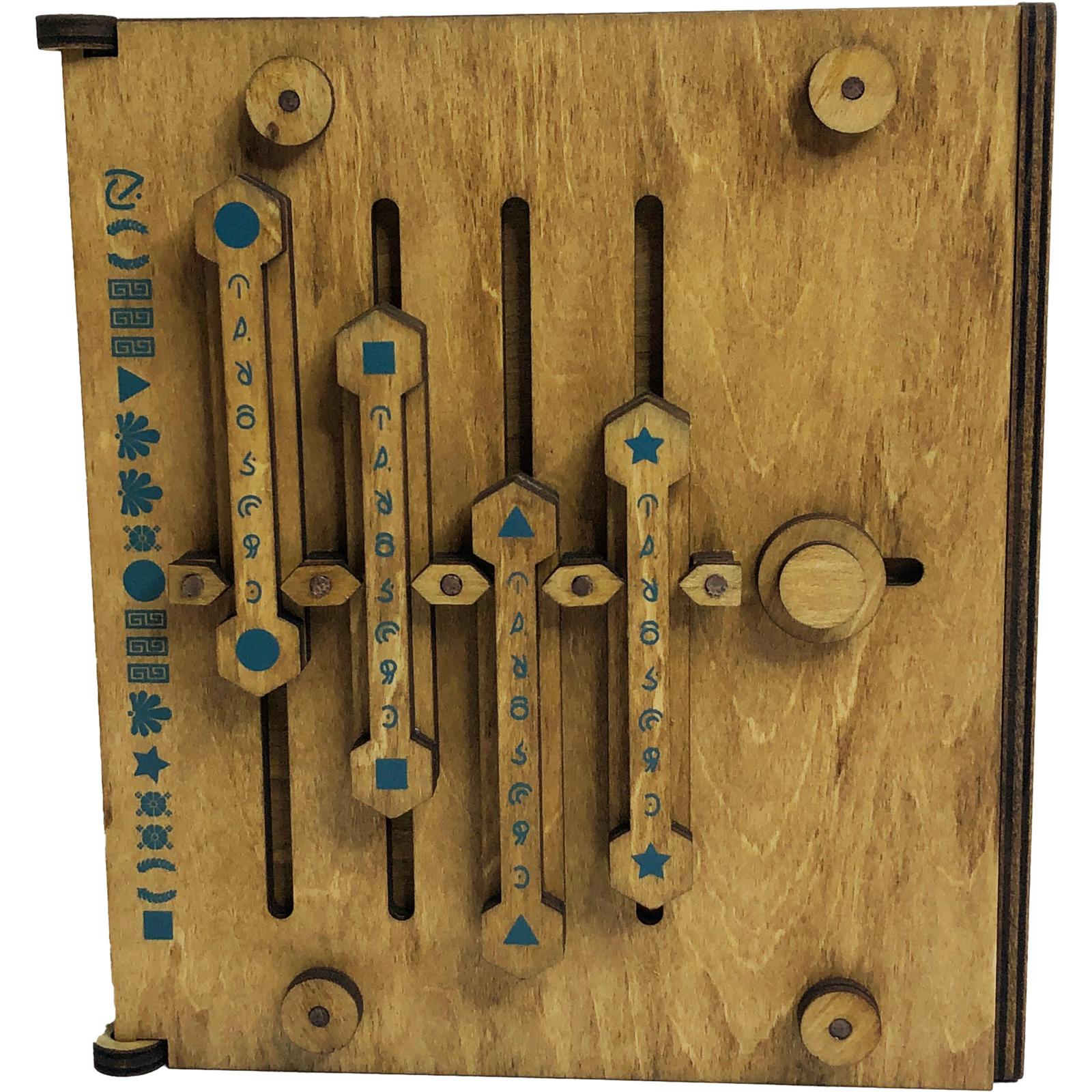 This puzzle box is inspired by the book-binding technology developed by the Ancient Romans during the reign of Caesar. Finding the correct position for the sliders requires you to solve the puzzle of the mysterious symbols painted all over the box.
