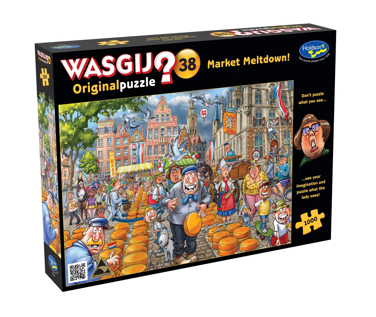In Wasgij? Market Meltdown! the cheese market is busier than ever, with locals and tourists alike gathering to purchase some local delicacies – even the dark clouds can’t dampen their spirits! Luckily for them, the sun has broken through the gloom and started to shine brightly on the market stalls below, but why does the sudden change in weather take everyone by surprise? What has the cheesemonger seen that’s stopped him in his tracks? That is the image you need to puzzle.Wasgij Original is the ‘what are they looking at?’ puzzle concept where you have to use your imagination and the clues provided to piece together what the characters in the image printed on the box are looking at.Approximate puzzle size 688×493mm.Manufactured in New Zealand by Holdson.Suitable for ages 8+ years.