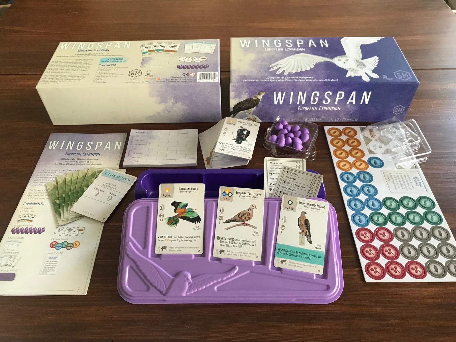In this first expansion to *Wingspan*, we increase the scope of the world to include the regal, beautiful, and varied birds of Europe. These birds feature a variety of new abilities, including a number of birds with round end abilities, abilities that increase interaction between players, and birds that benefit from excess cards/food. Along with the new bonus cards, they’re designed to be shuffled into the original decks of cards (and cards from future expansions).The European Expansion also includes an additional tray for storing the growing collection of birds (past, present, and future), as well as 15 purple eggs, extra food tokens, and a colourful new scorepad designed for both multi-player and single-player scoring.*Featured Components:** 81 bird cards (all unique, all new)* 15 egg miniatures (purple)* 5 bonus cards* 4 Automa cards (2 of which are bonus cards)* 1 custom tray with lid* 1 scorepad (multi-player on one side, solo on the other)* 1 rulebook* 5 goal tiles* 38 food tokens* 1 reference tile* 1 box (296×144×80mm; 0.7 kg)*The Dice Tower Seal of Approval is a trademark of The Dice Tower, LLC and is used with permission.*